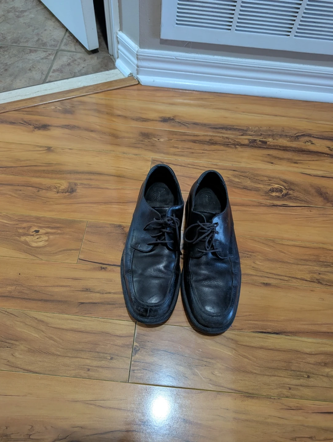 Men's black leather dress shoes by Rockport. These shoes are a size 10 US, 44 EUR. They feature a leather upper and a durable sole.