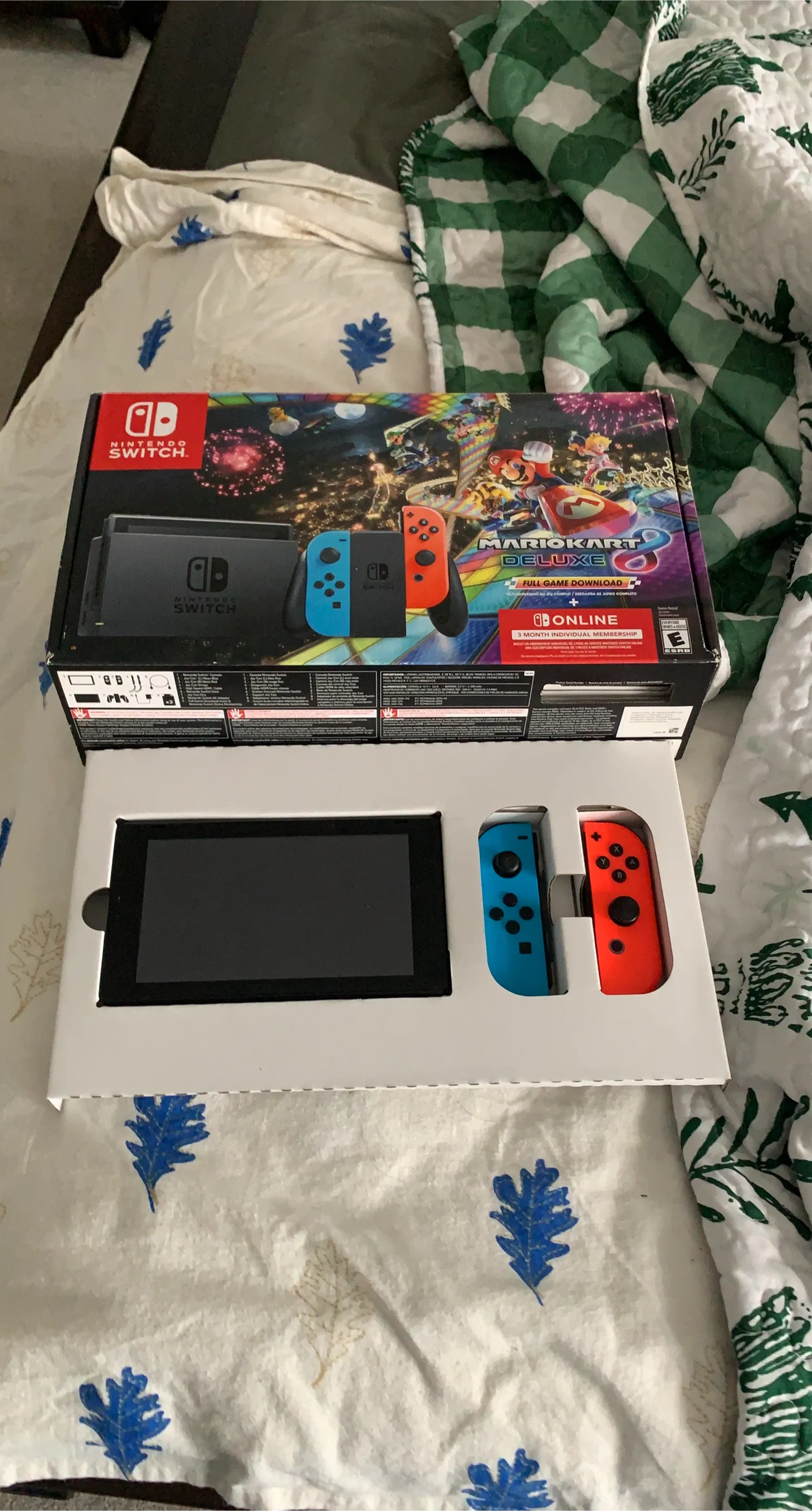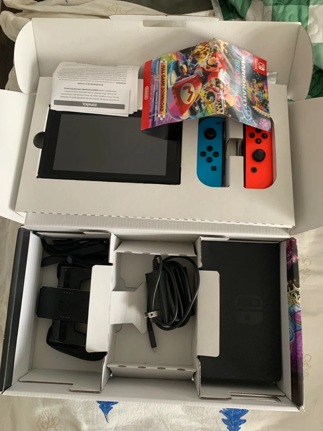 This is a Nintendo Switch console bundle that includes the Mario Kart 8 Deluxe game. It comes with the console, Joy-Con controllers in blue and red, dock, AC adapter, and all necessary cables. Enjoy gaming on the go or at home! Comes with pro gaming controller as well as an all white Nintendo switch case!