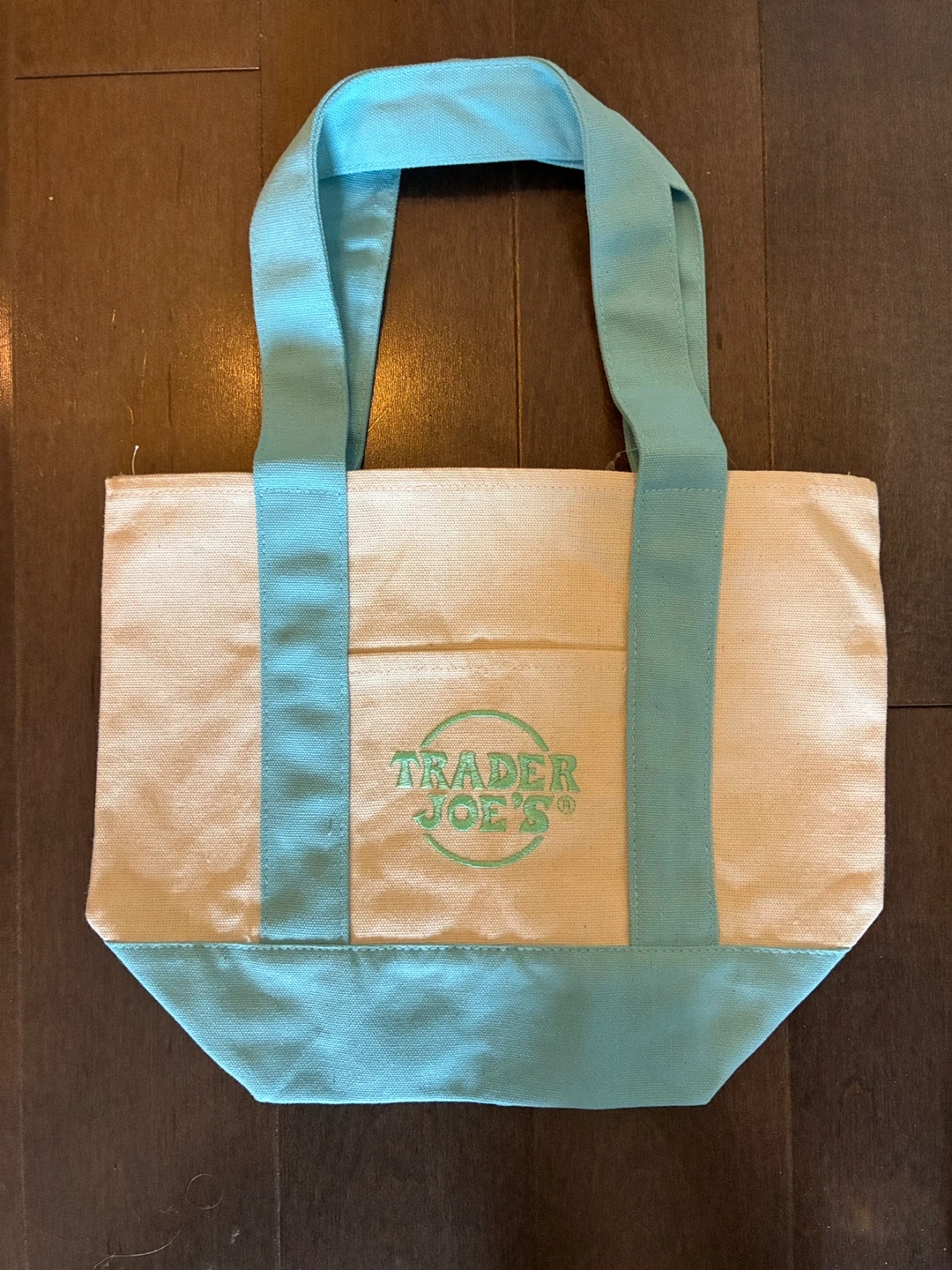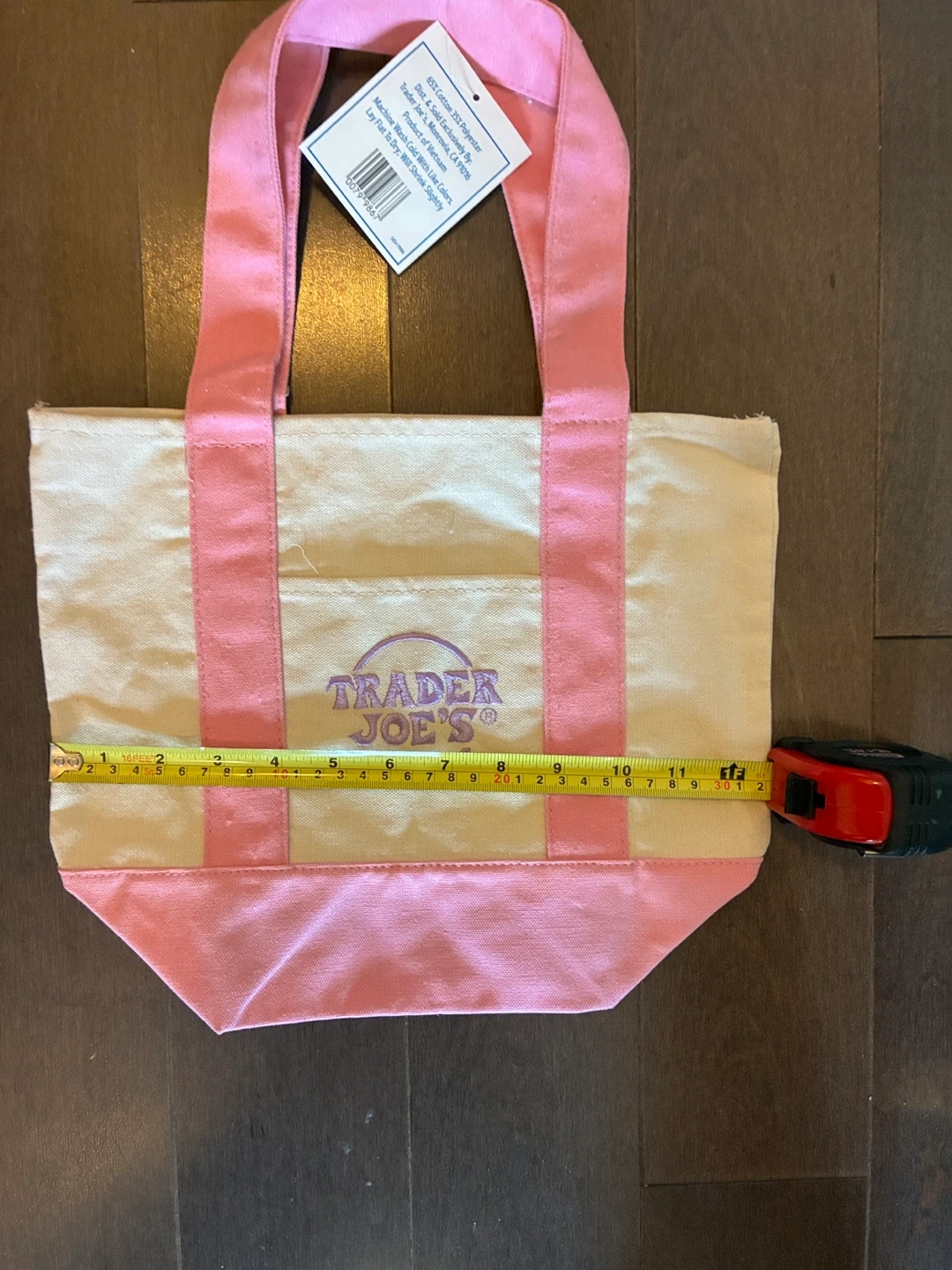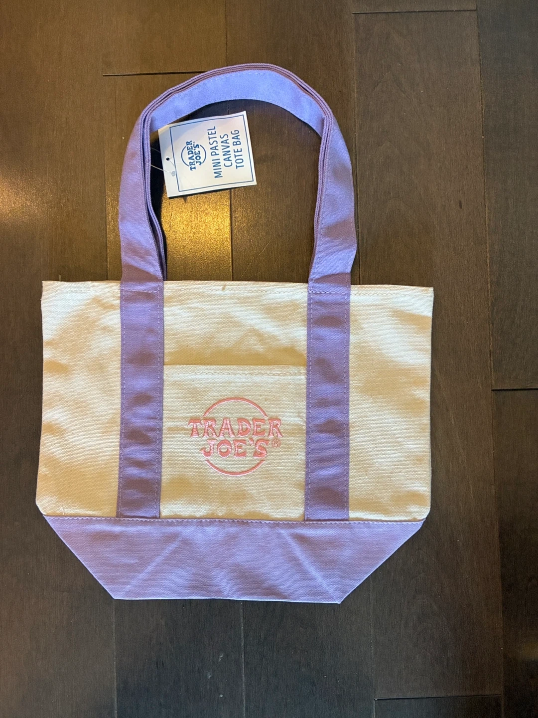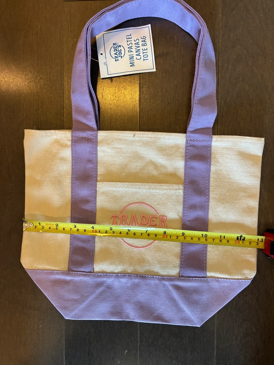 Trader Joe's mini canvas tote bag in a pastel lavender colour. It's made of 100% Cotton and measures approximately 10 inches wide. This little bag is super handy for small errands or as a lunch bag! Selling for $20 each.