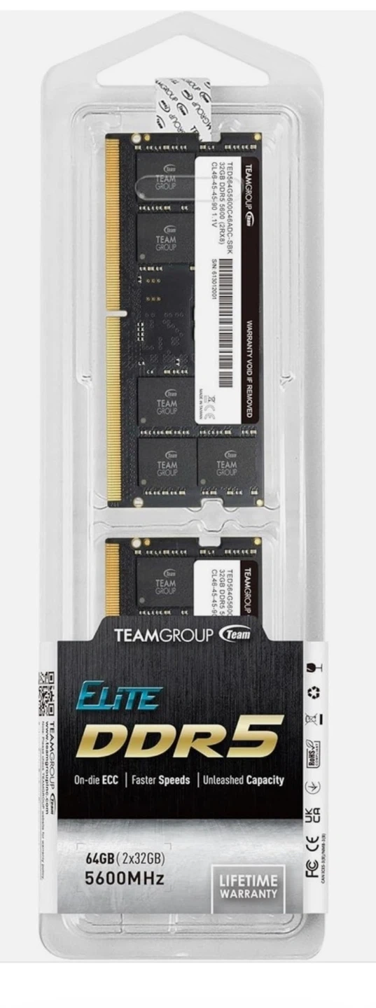 For sale - Unused - Brand New - TEAMGROUP Elite 64GB kit, featuring two 32GB DDR5 RAM modules with a speed of 5600MHz. It's designed for laptop system upgrades and comes with a lifetime warranty. Supports on-die ECC for enhanced stability.