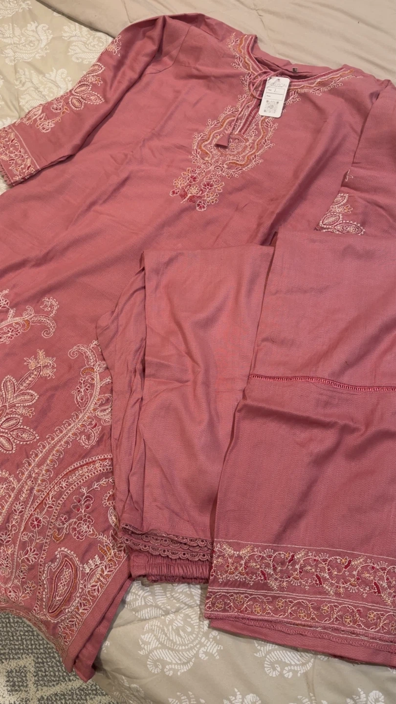 This exquisite Daily/Basic Wear 3 Piece Kurta Set is perfect for all seasons. The long PINK Dhanak kurta features intricate embroidered work, paired with a straight trouser in the same fabric. The set includes a matching Dhanak dupatta for a complete look. Elevate your wardrobe with this tasteful ensemble from Saifron.