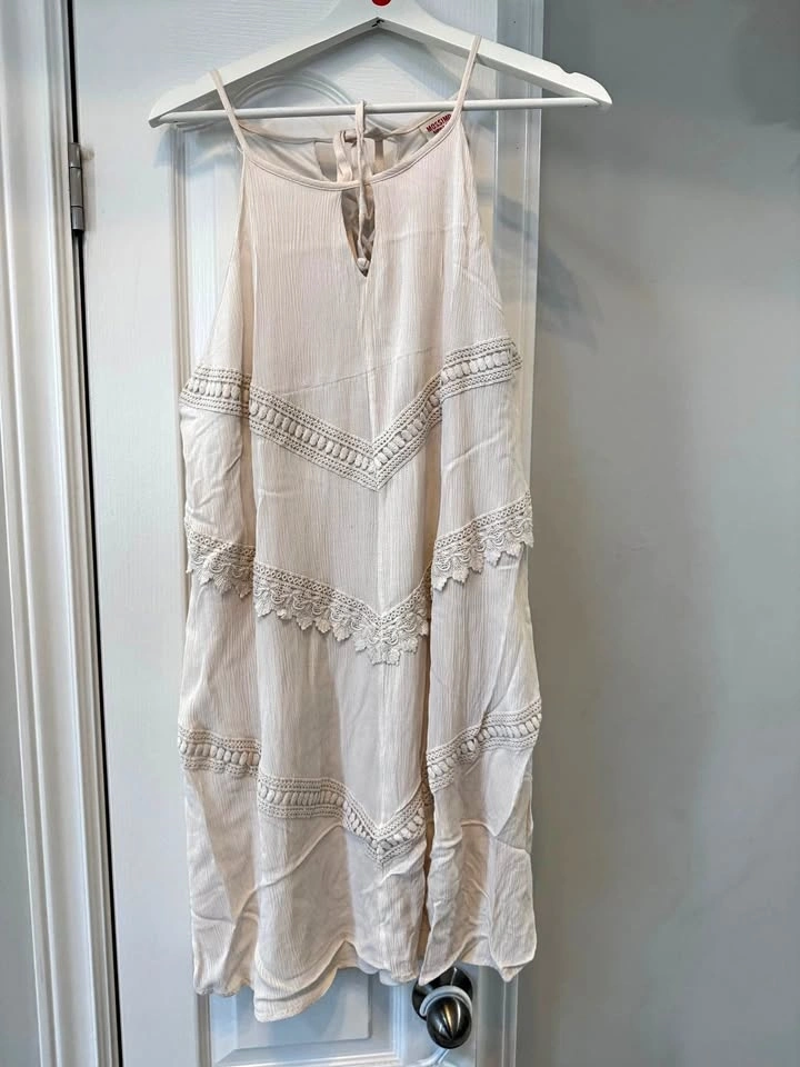 Cream/off-white, Size XL. This dress sits above the knee if you have a longer torso. Wore this for one event. It does not have much stretch and is double lined, making it very comfortable and not see-through. Runs true to size but would fit nicely as an oversized dress if you normally wear a large. The details on this dress make it easy to dress up or dress down, depending on whether you want to wear sneakers with it or dress shoes!