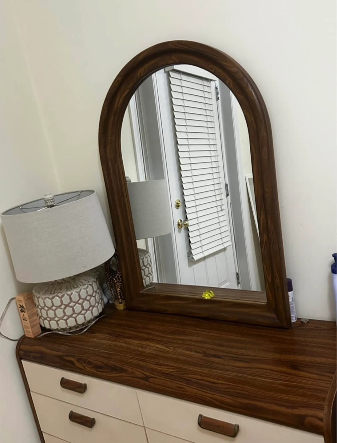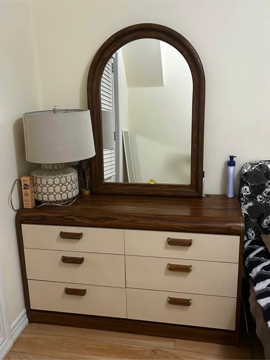 A classic six-drawer dresser with a matching arched mirror. It features a rich wood grain finish on the top and frame, paired with cream-coloured drawer fronts and wooden handles. This dresser provides ample storage space.
