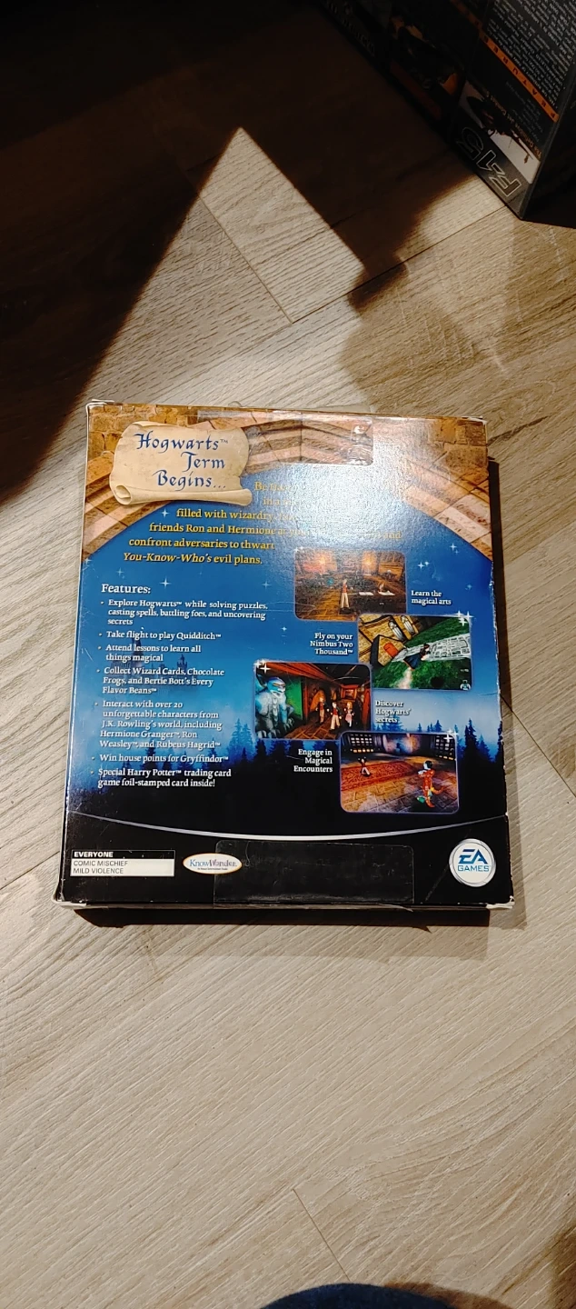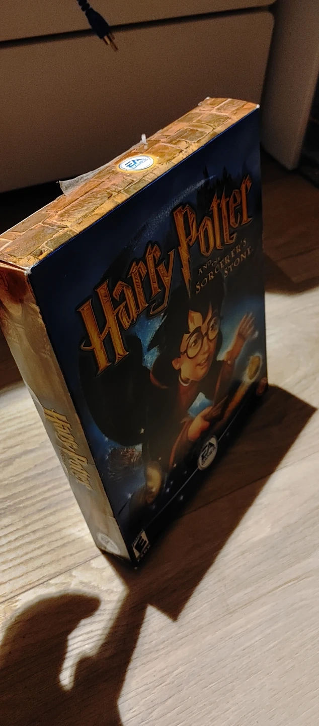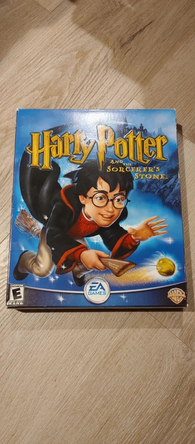 This PC game is Harry Potter and the Sorcerer's Stone. It comes with the original box, game CD, and install guide. Features include solving puzzles and flying on a broomstick.