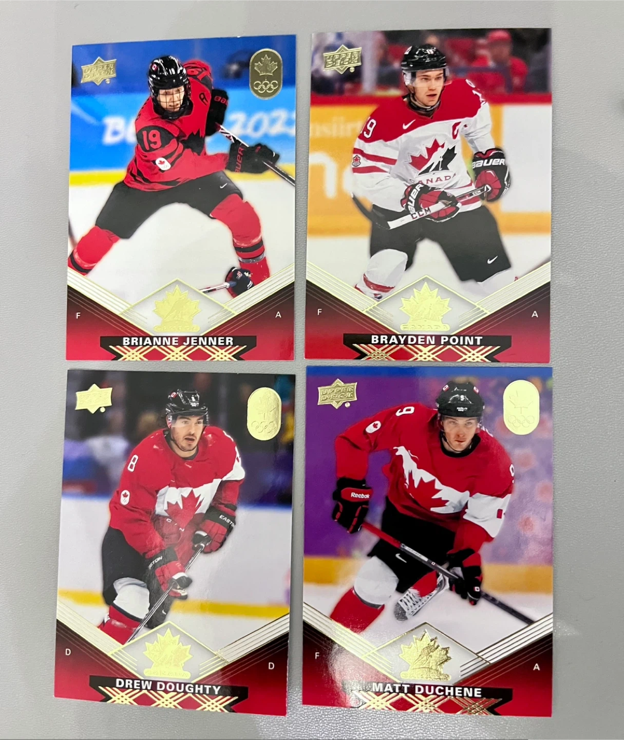 This lot includes four Upper Deck 2025-26 Canadian Olympic hockey cards. Features players Brianne Jenner, Brayden Point, Drew Doughty, and Matt Duchene. Perfect for any hockey card collector!