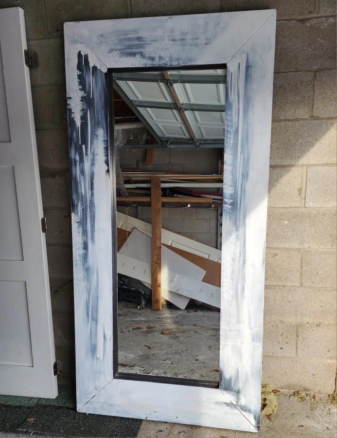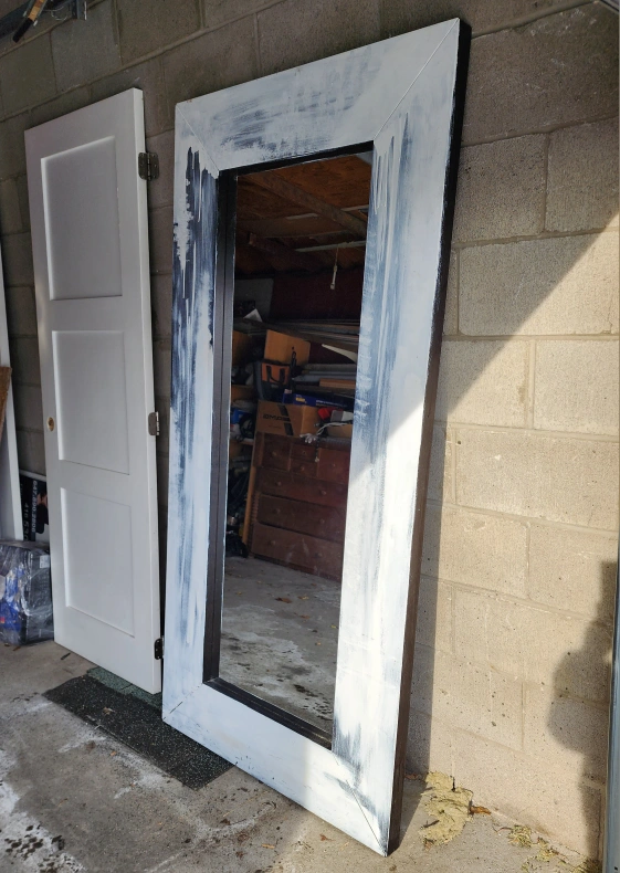 The frame was purposely distressed and splashed with white paint to create distressed rustic look.