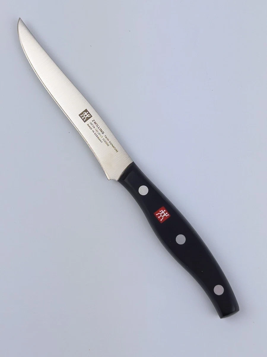 This is a Zwilling Twin Signature utility knife. It's made in Germany with a stainless steel blade and a black synthetic handle. It's a handy knife for various kitchen tasks.