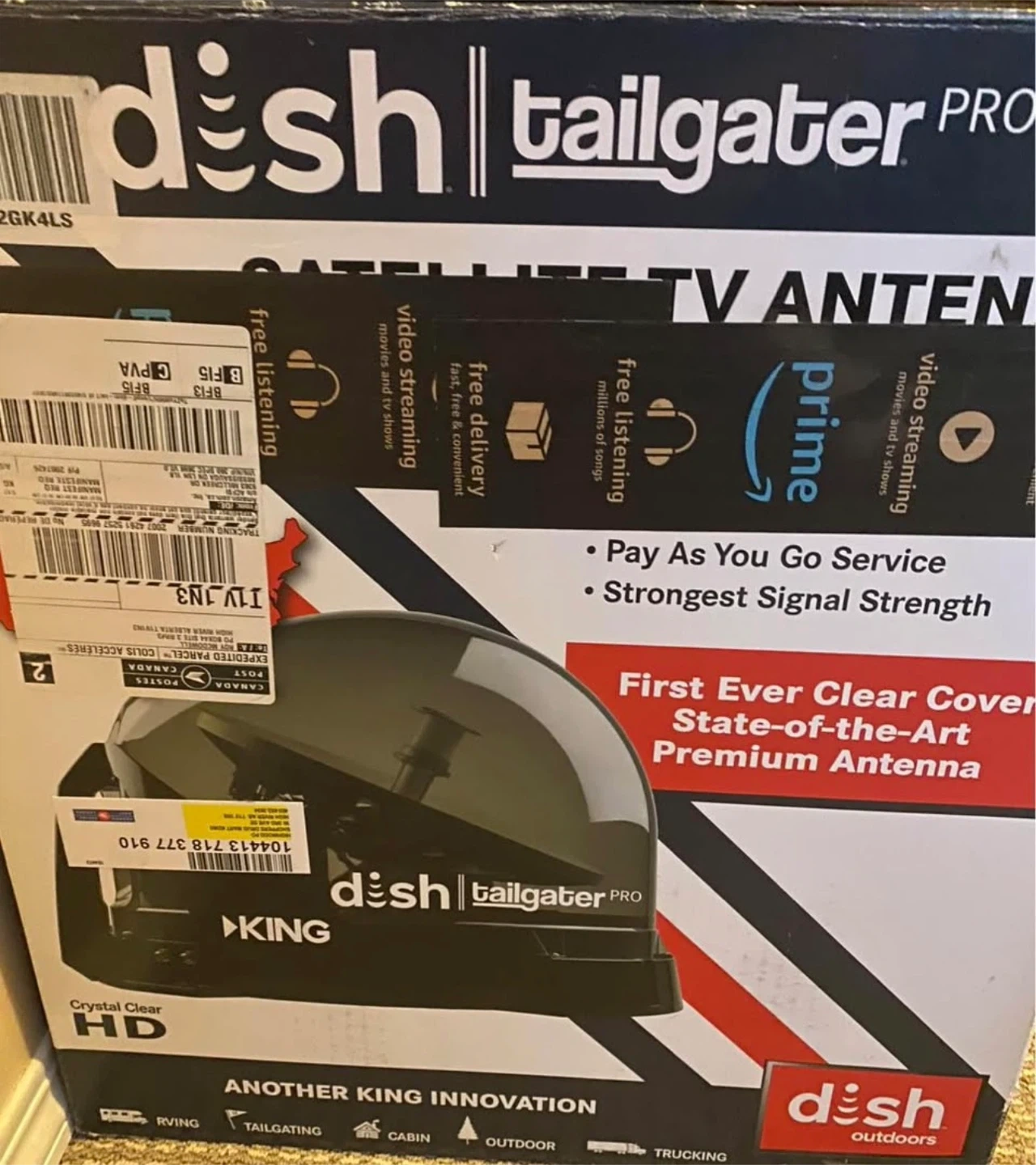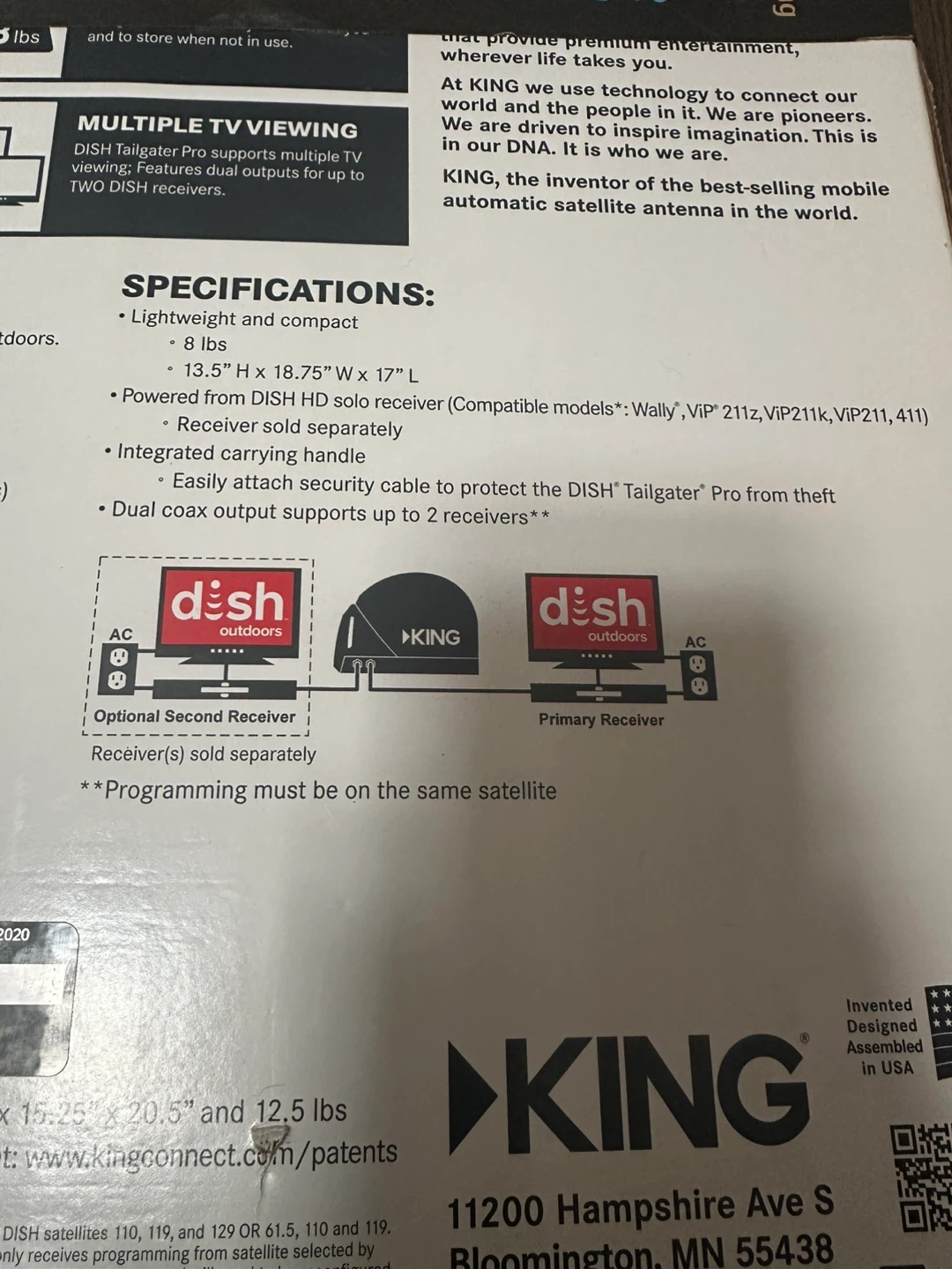 This KING Dish Tailgater Pro is a portable satellite TV antenna. It's designed for multiple TV viewing and features dual outputs for up to two receivers. The antenna is lightweight and compact, with an integrated carrying handle for easy transport. It's powered by a DISH HD solo receiver and includes a 50' coaxial cable and quick start guide.