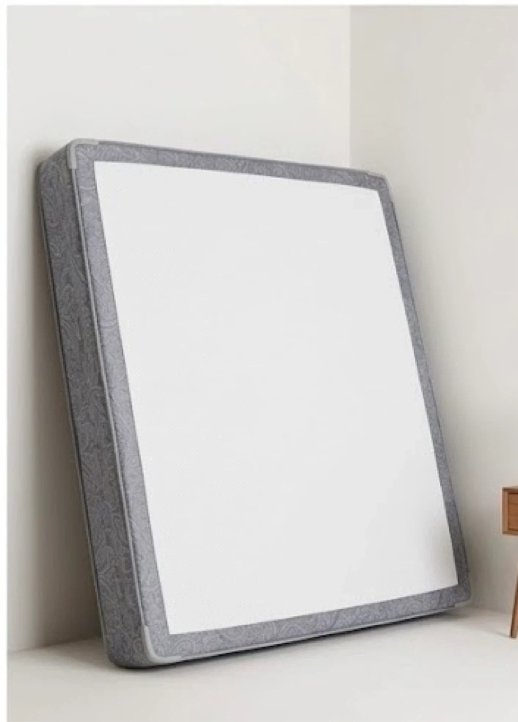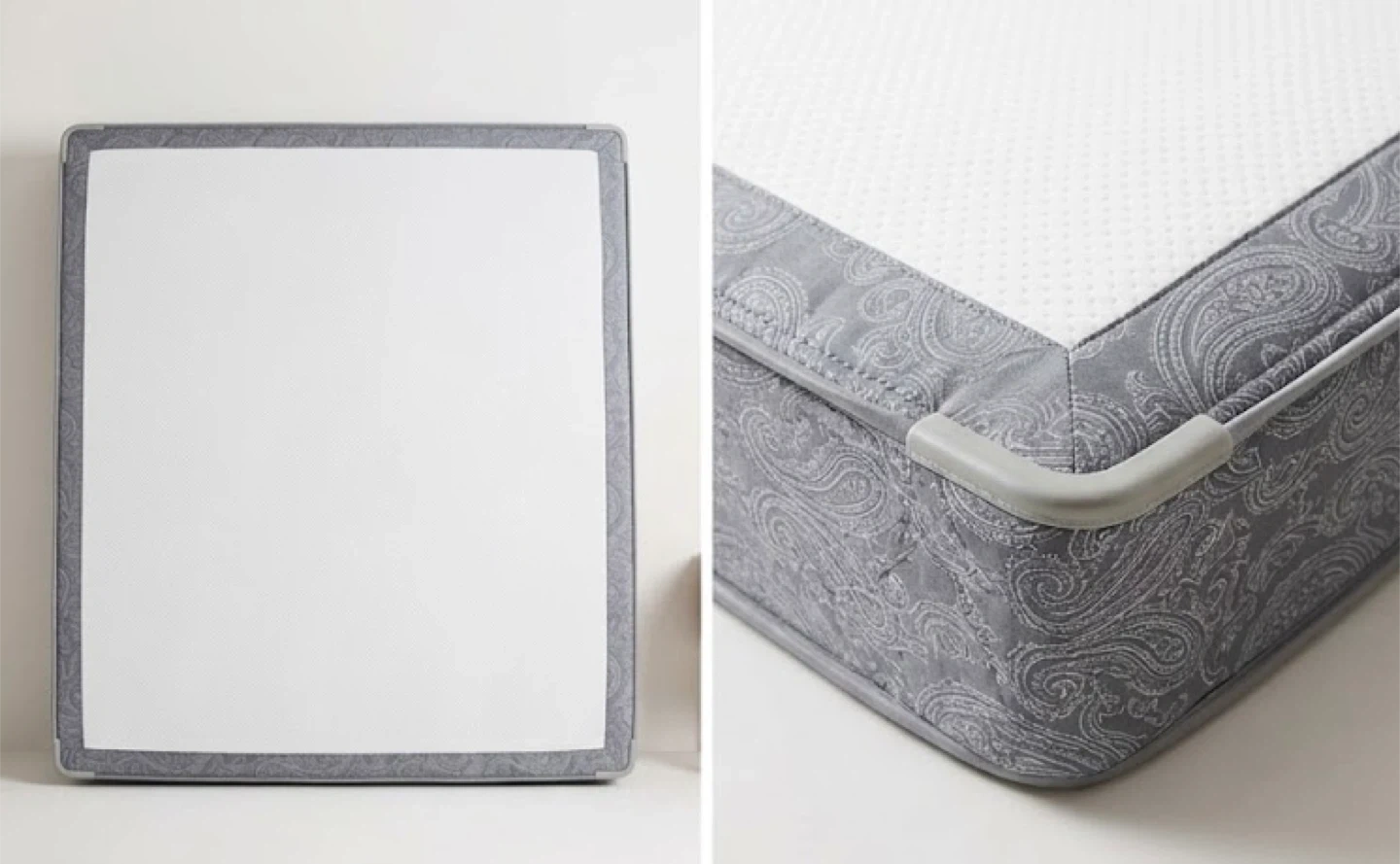 Selling a high-quality, King Size Box Spring in excellent condition. It features a durable wood/steel frame construction with a modern grey paisley fabric finish and reinforced corner guards for extra protection.