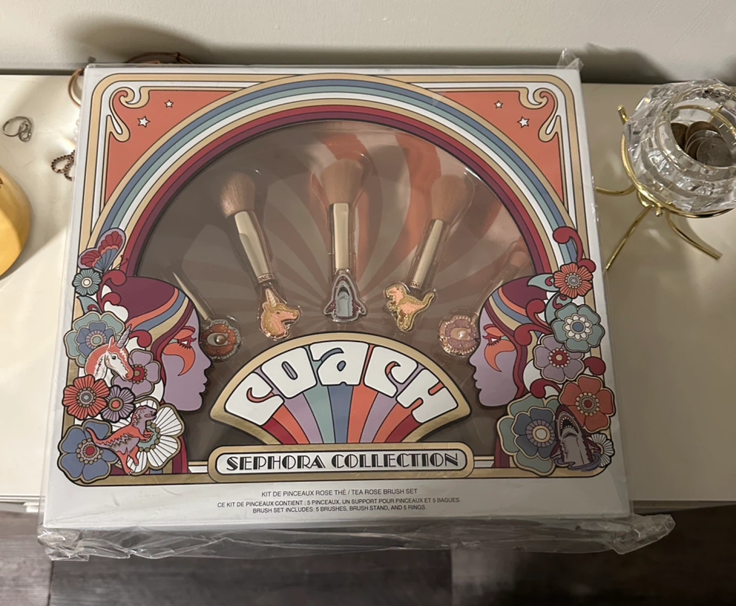 This limited-edition collaboration features a 5-piece makeup brush set with a fun glitter brush stand. The set includes a powder brush, angled brush, highlight brush, shadow brush, and crease brush. It also comes with 5 rings.