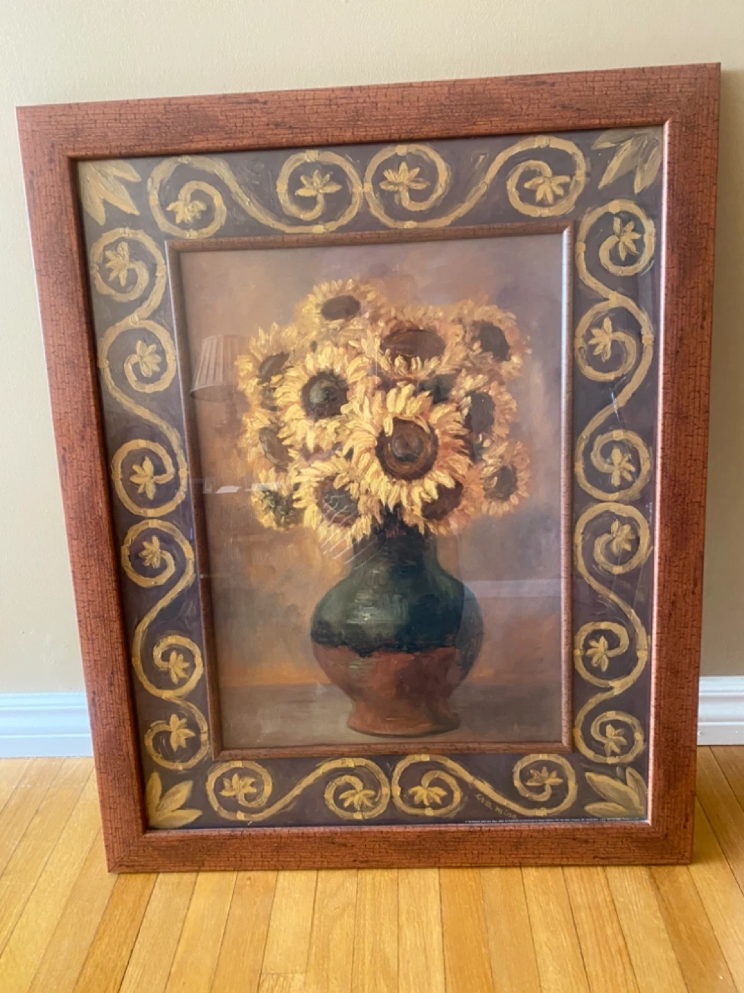 Framed art print featuring a bouquet of sunflowers in a vase. Dimensions are 22in x 28in (55cm x 70cm). This piece is from Crystal Art Gallery. It's ready to hang!