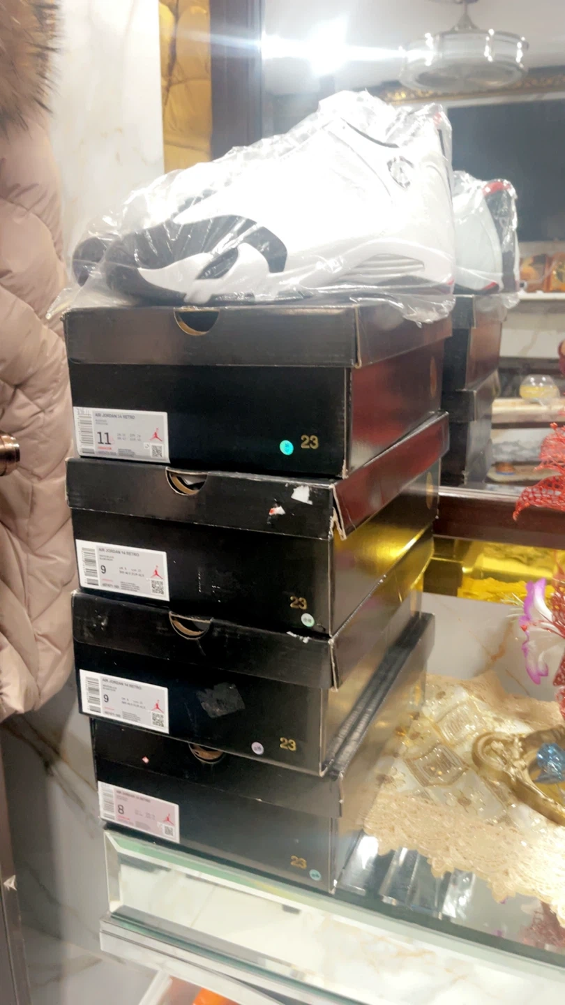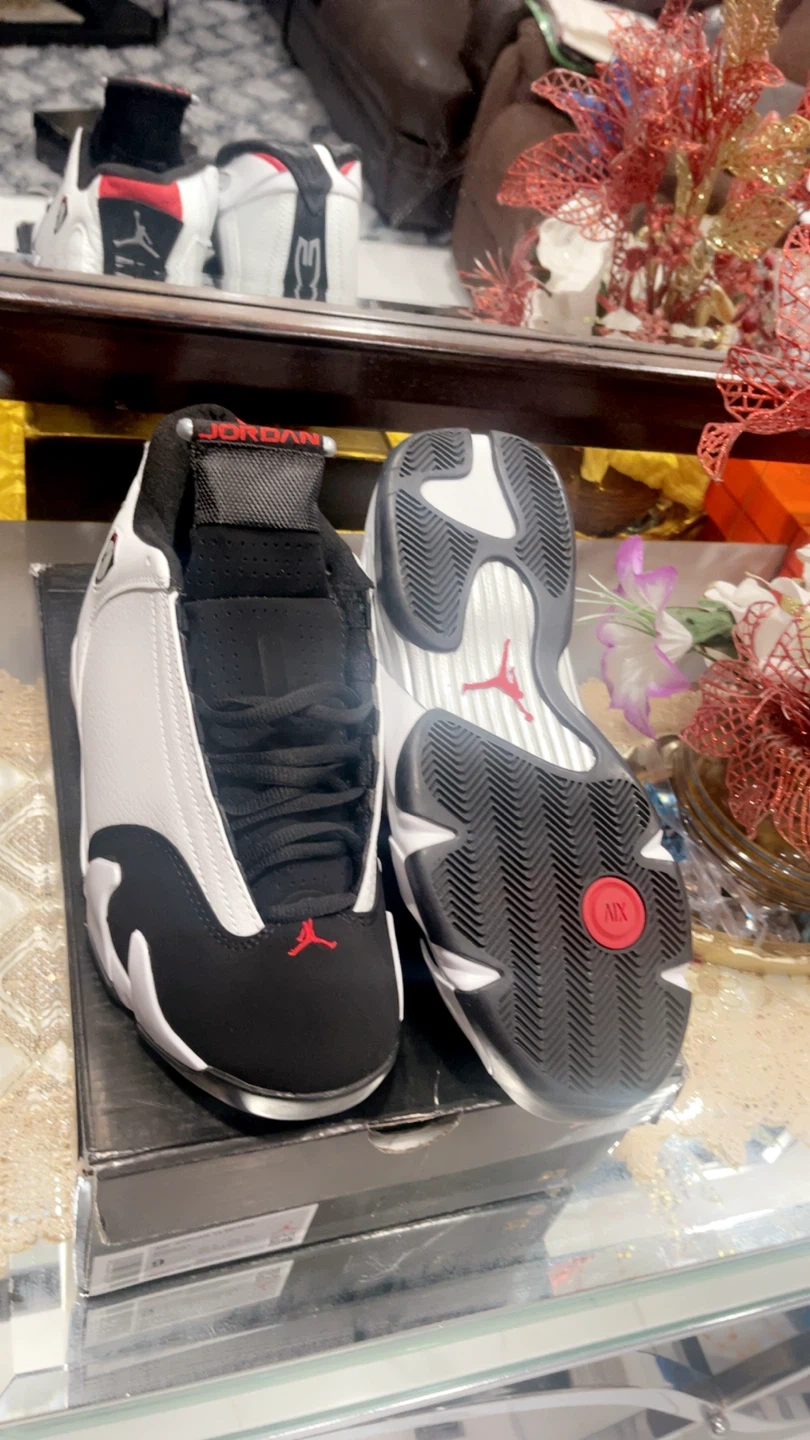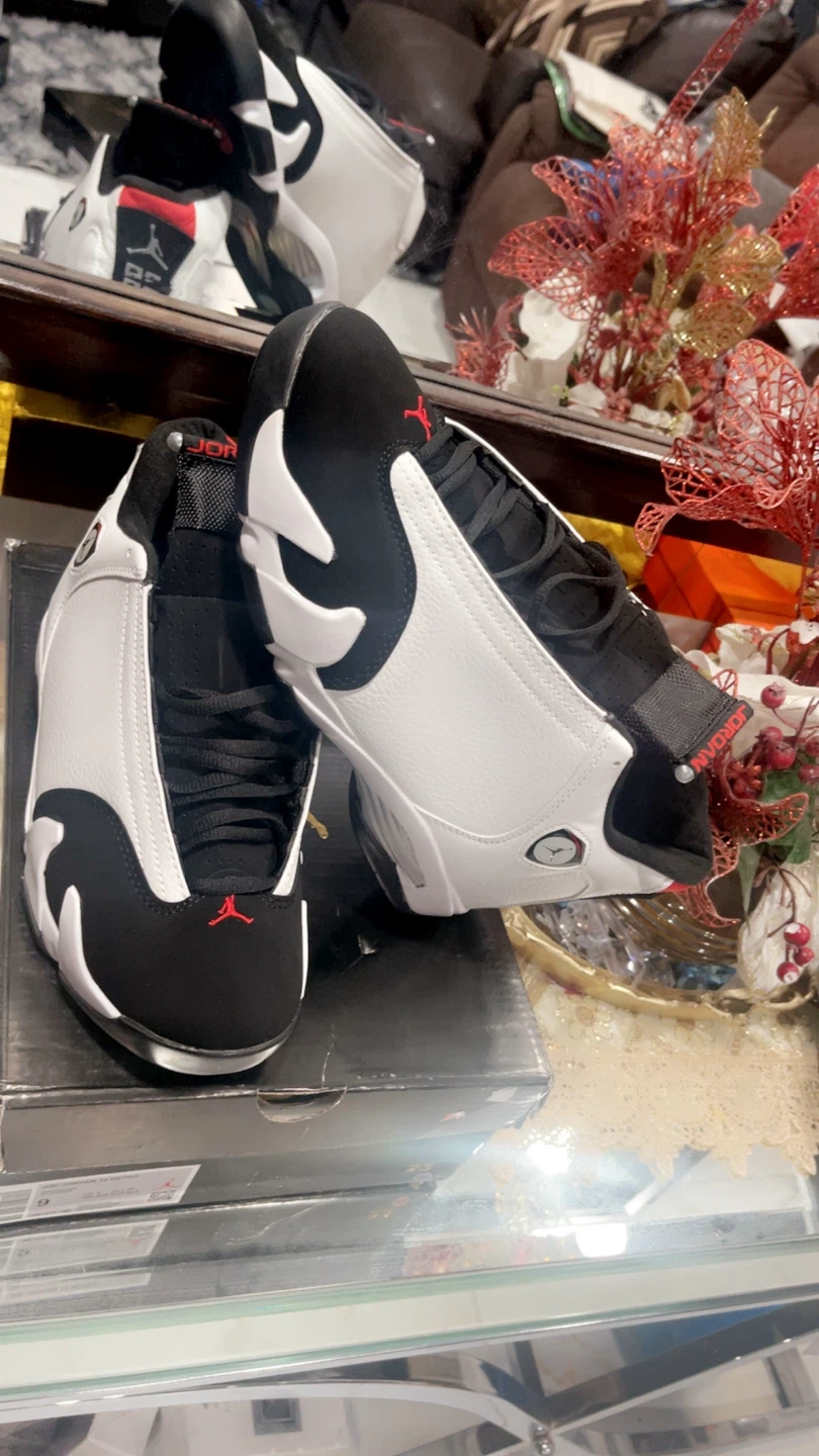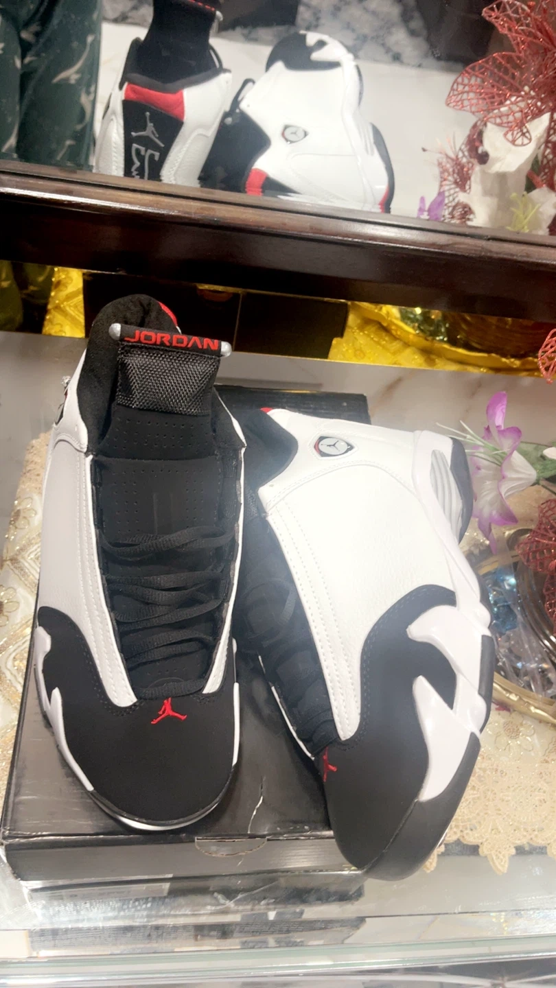 These are a pair of Air Jordan 14 Retro sneakers in a white, black, and red colorway. Includes original box. Size 8, 9, 10, 11