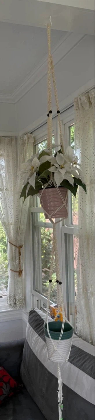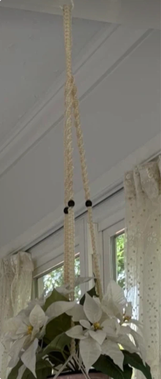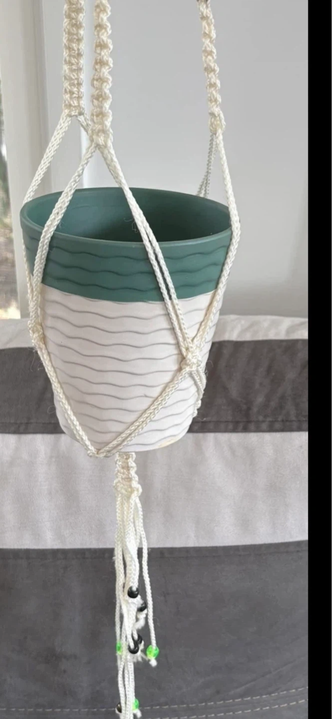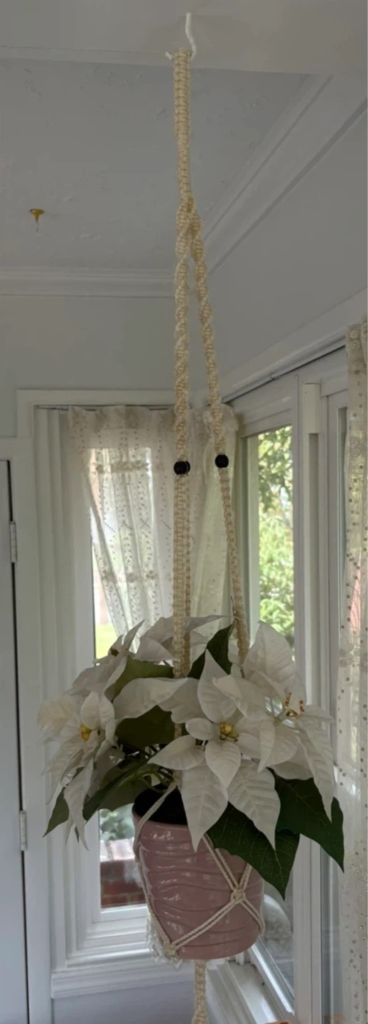 This is a handmade macrame plant hanger. It's made of White colored cord and features decorative black beads. The hanger It consists of two sections, which means you can place two pots. and designed to hold a medium-sized pot. It's perfect for displaying your plants!
