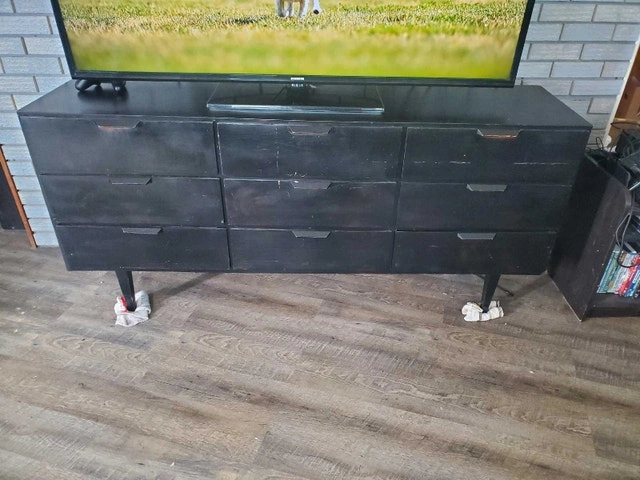 This is a 9 drawer dresser with a good amount of storage space for clothes and other belongings. Pre-owned condition.