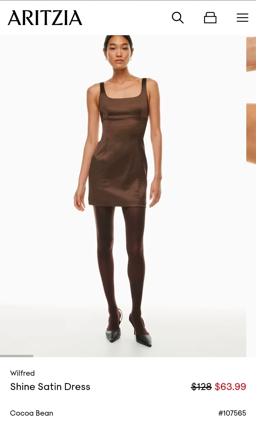 "A Wilfred signature perfected season after season, this is a lined mini dress with a double square neckline and princess seams for shaping. It’s cut from gutsy, shiny stretch satin made with wood-based fibres sourced from responsibly managed forests."