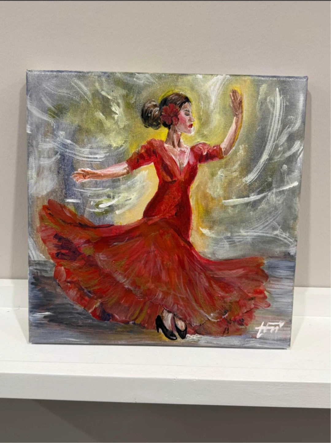 This is a lovely painting of a flamenco dancer in a red dress. The painting is on canvas and would look great in any rooms. Perfect to display on its own as part of the collection. Perfect unique gift for dance aficionados.