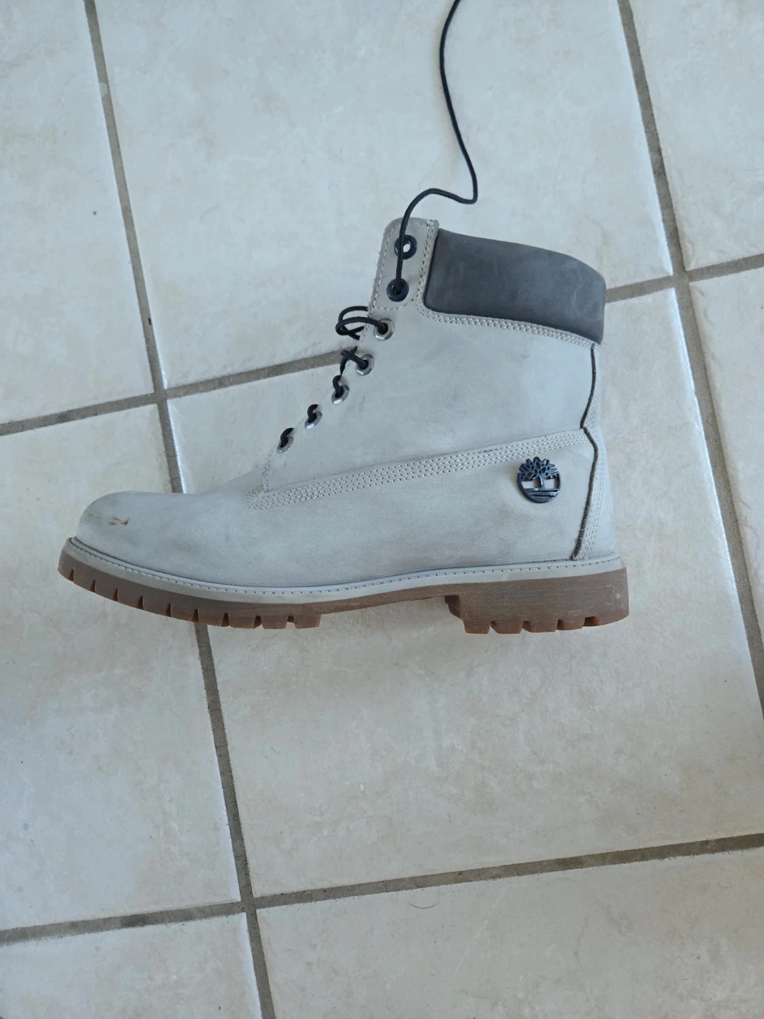 Timberland boots in a light grey colour. These are sturdy and stylish footwear. They're great for casual wear or for trekking outdoors! 50th anniversary release. No longer made in this color.