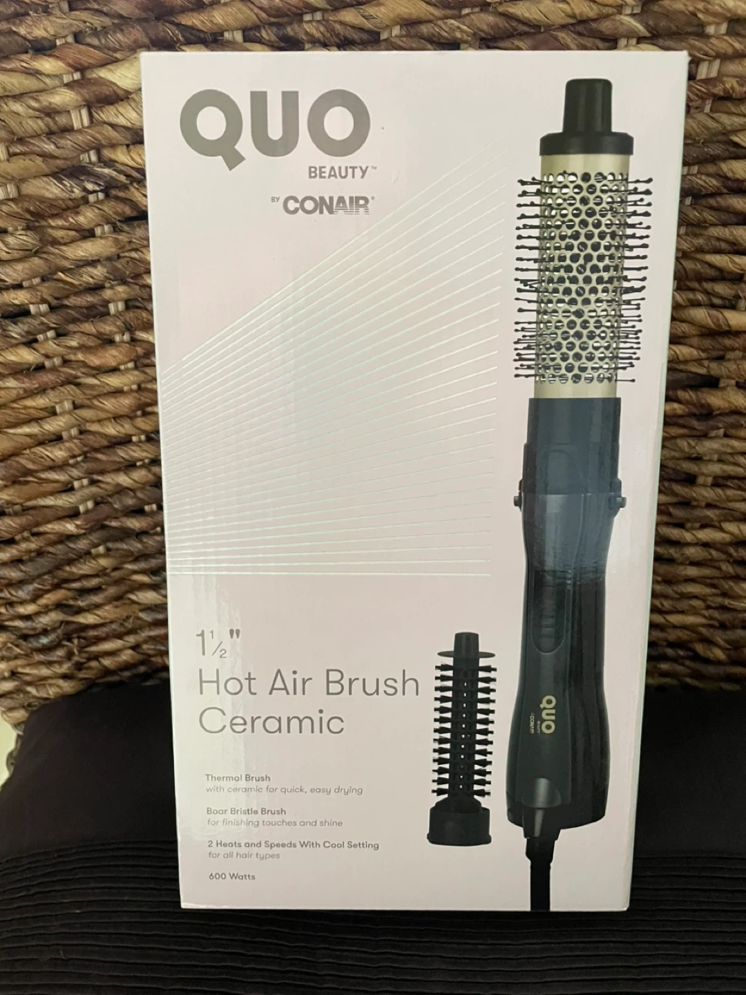 This is a QUO Beauty by Conair 1 1/2 inch hot air brush with ceramic barrel. It features a thermal brush with ceramic for quick, easy drying. Includes two heat and speed settings with a cool setting for all hair types. 600 Watts. This has never been used. Bought at Shoppers, retails there for $44.