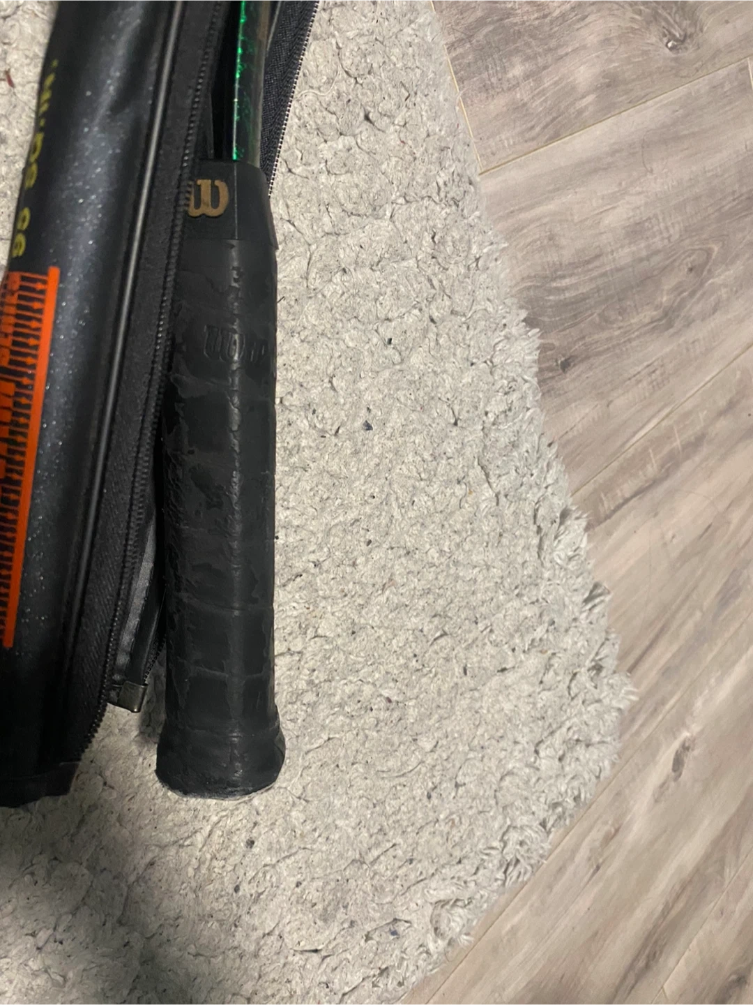 This is a Wilson Staff Series tennis racquet. It comes with a protective cover. The racquet features a green trim and a black grip.