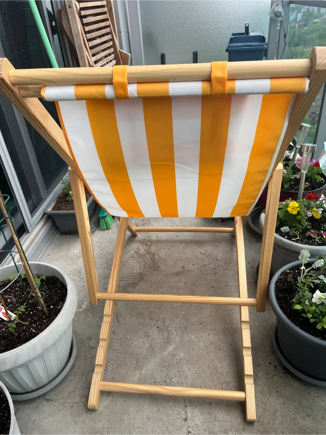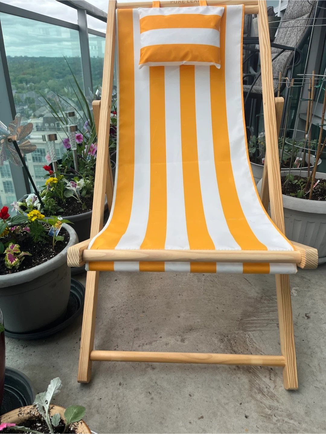 This Pure Leaf deck chair x 2 features a classic orange and white striped pattern. It comes with a matching pillow for added comfort. The wooden frame folds for easy storage.