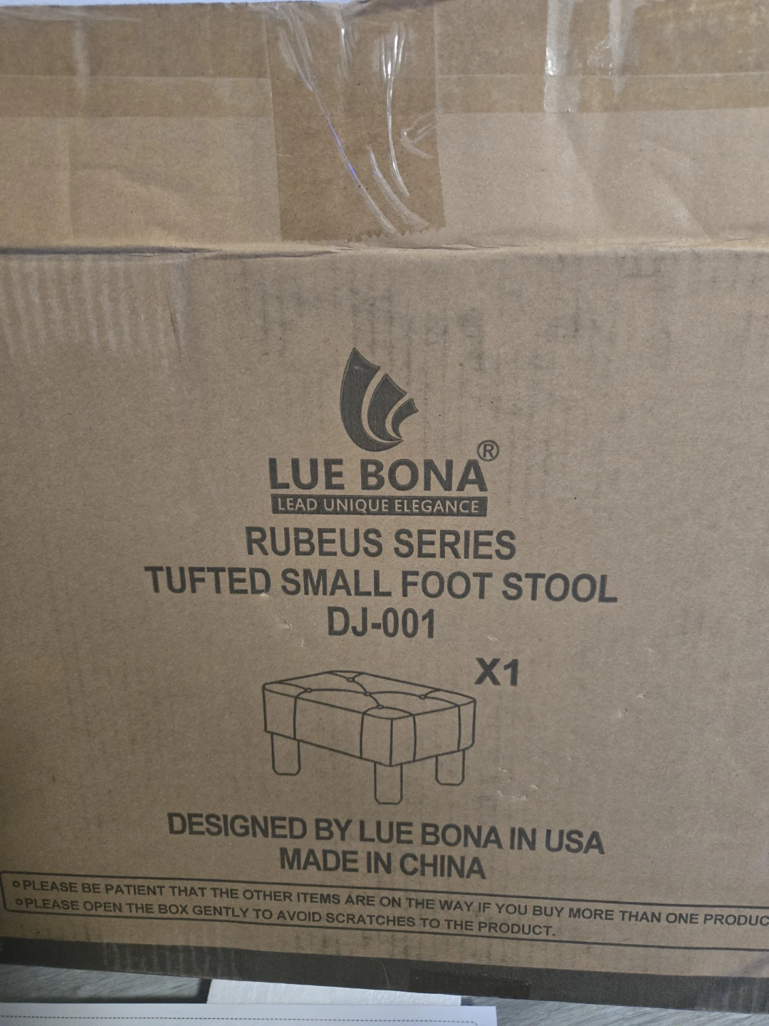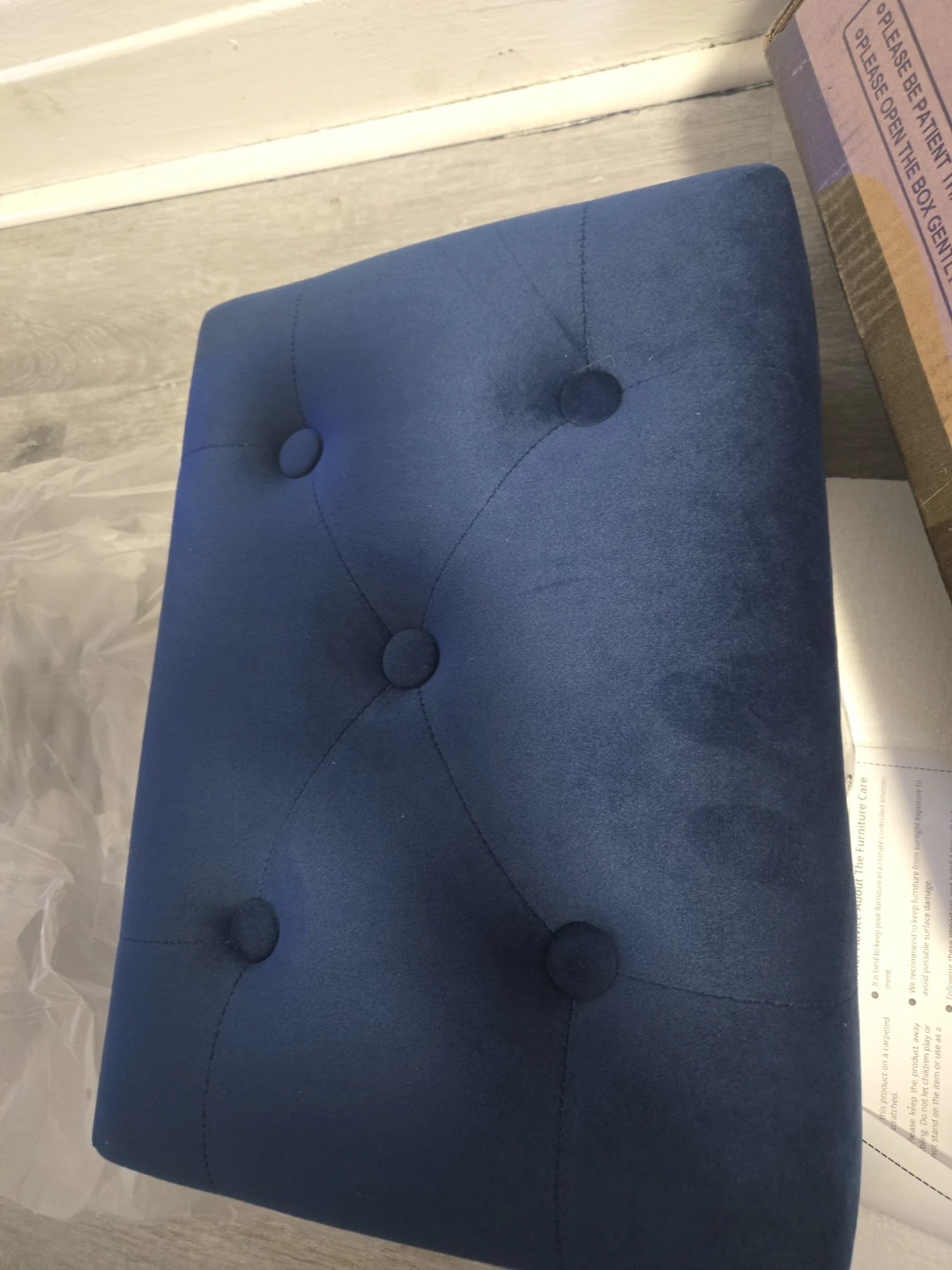This is a navy blue tufted small foot stool from Lue Bona. It features a velvet-like fabric upholstery with button tufting. The stool has four short, sturdy legs.