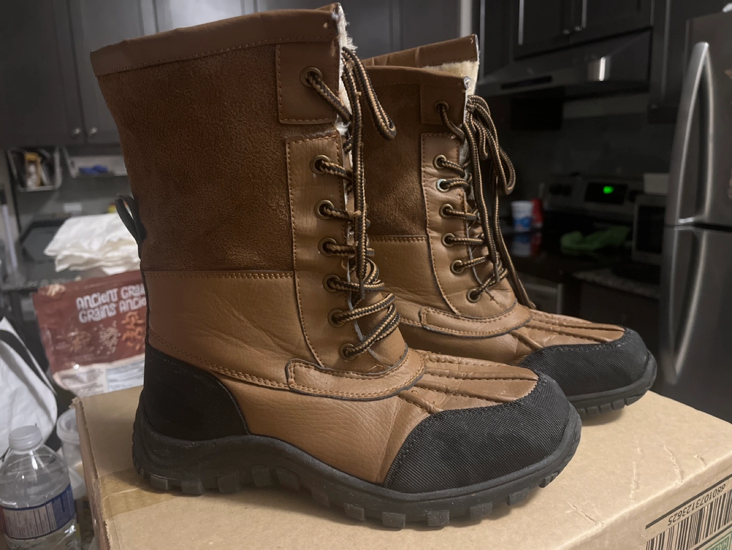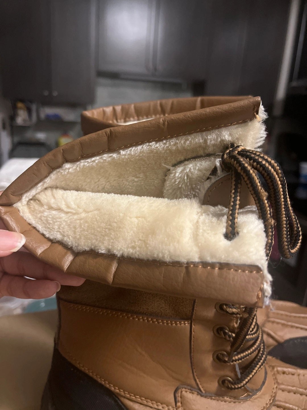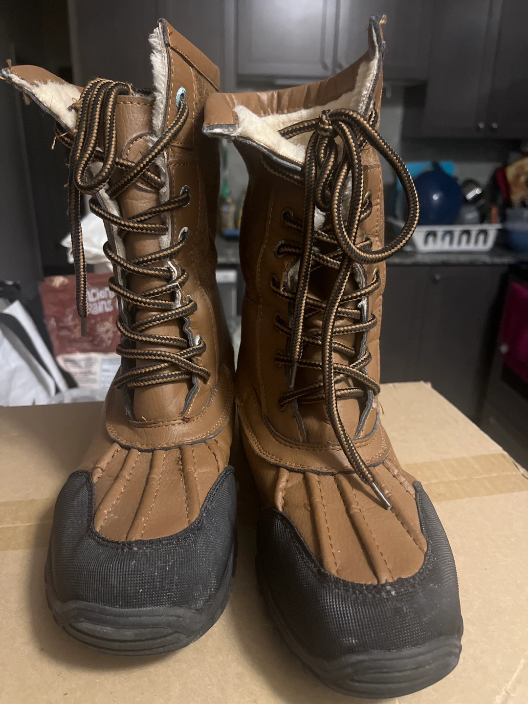 Brown faux leather winter boots with lace-up closure and a fleece lining.