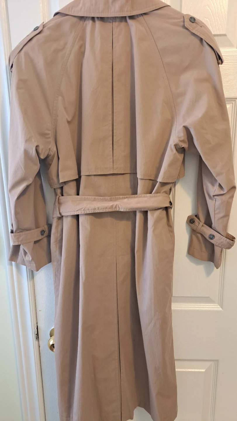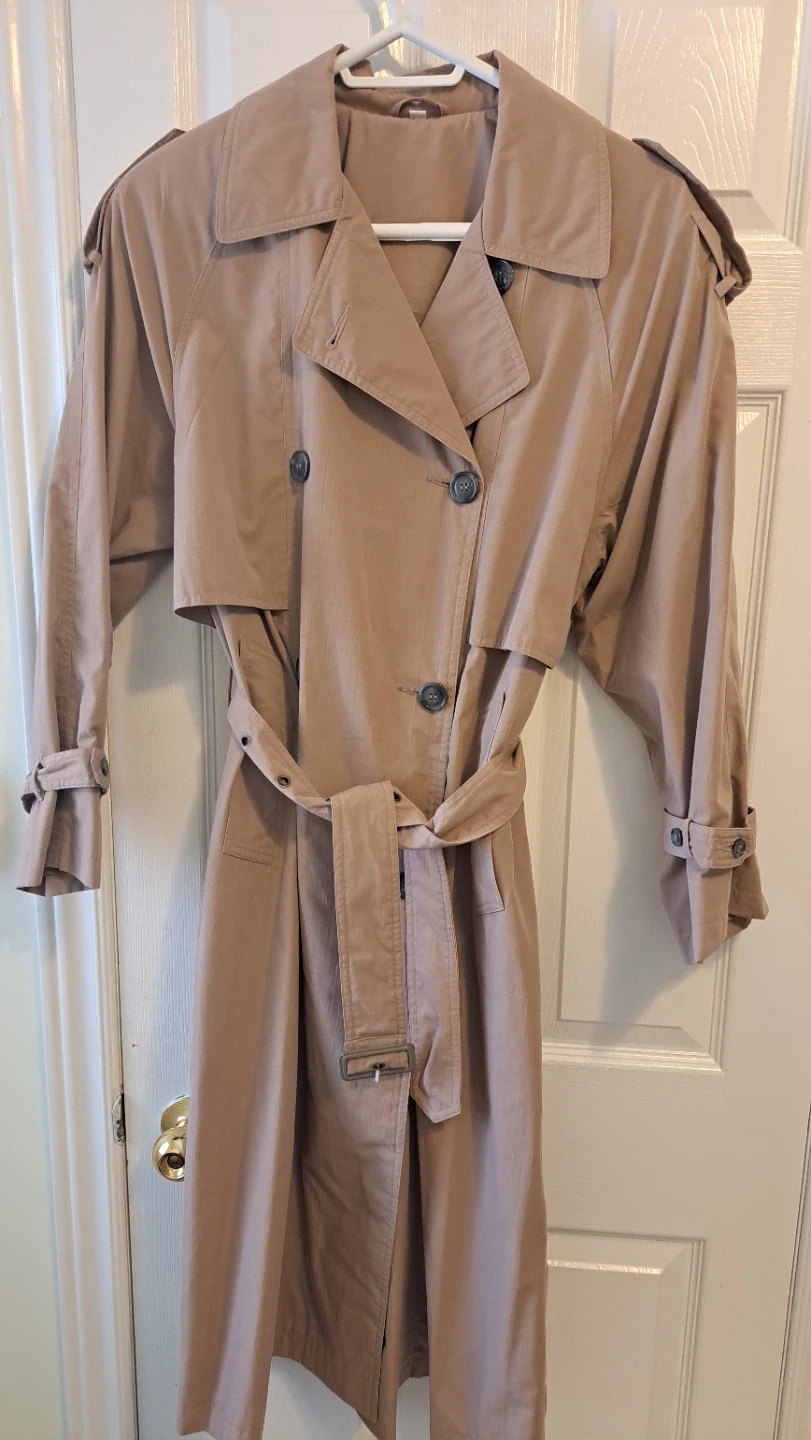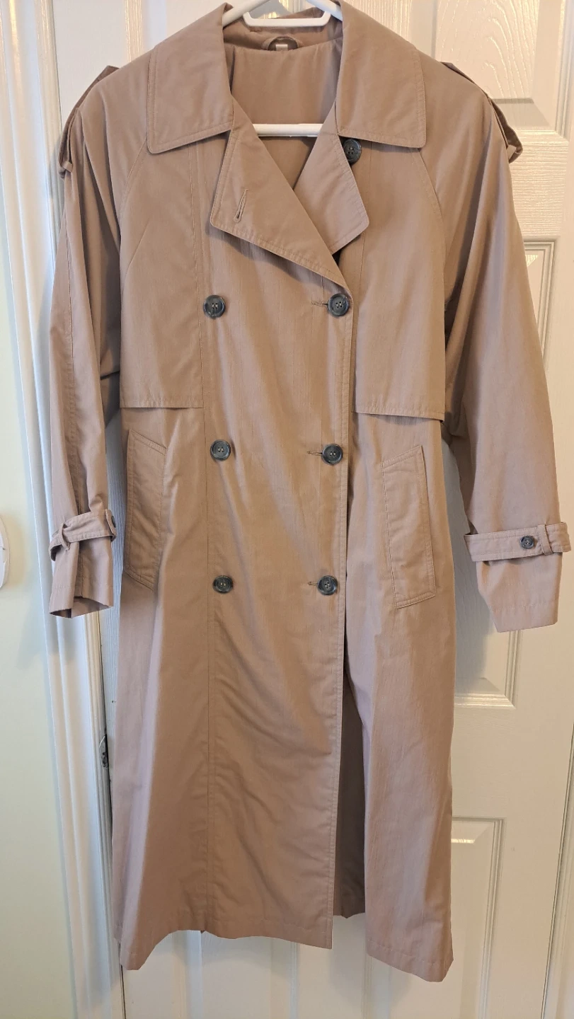 A timeless woman tan trench coat with a double-breasted closure and belted waist. It's a size medium and crafted from a durable fabric. This classic outerwear piece is great for transitional weather!