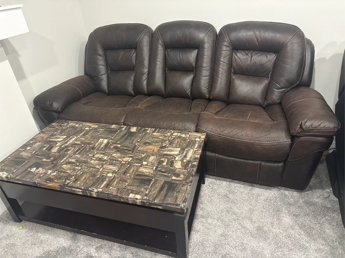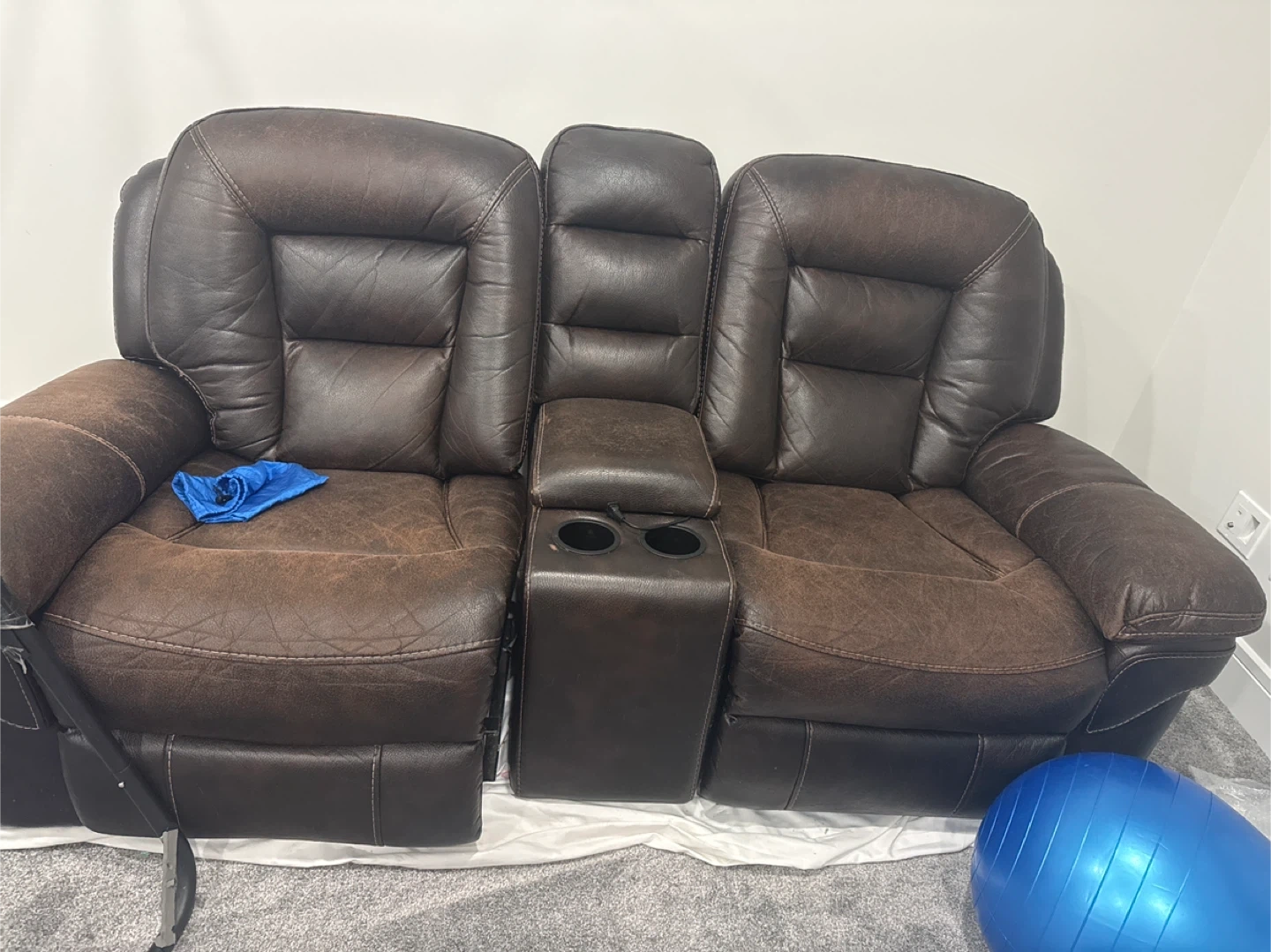 Comfortable brown leather reclining sofa with a centre console and cup holders. It features three plush seats and a deep-seated design, offering ample space for relaxation. This sofa's rich, distressed leather look adds a warm touch to any living space. Reclining mechanism is smooth and easy to operate.
