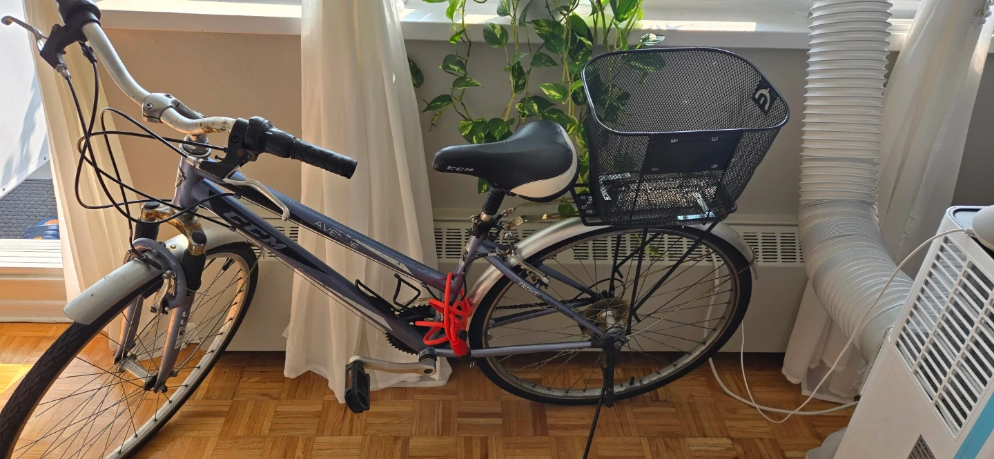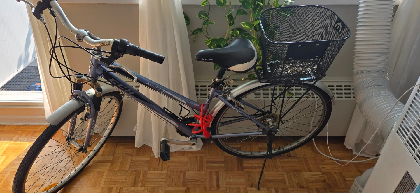 This CCM Avebury hybrid bike is a comfortable ride for commuting or casual trips. It features a sturdy frame and a convenient front basket for carrying essentials. The bike is equipped with a kickstand and a red lock.