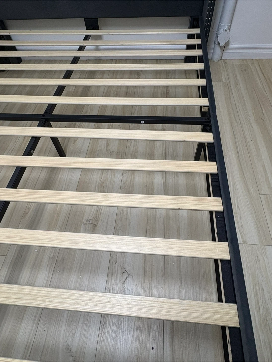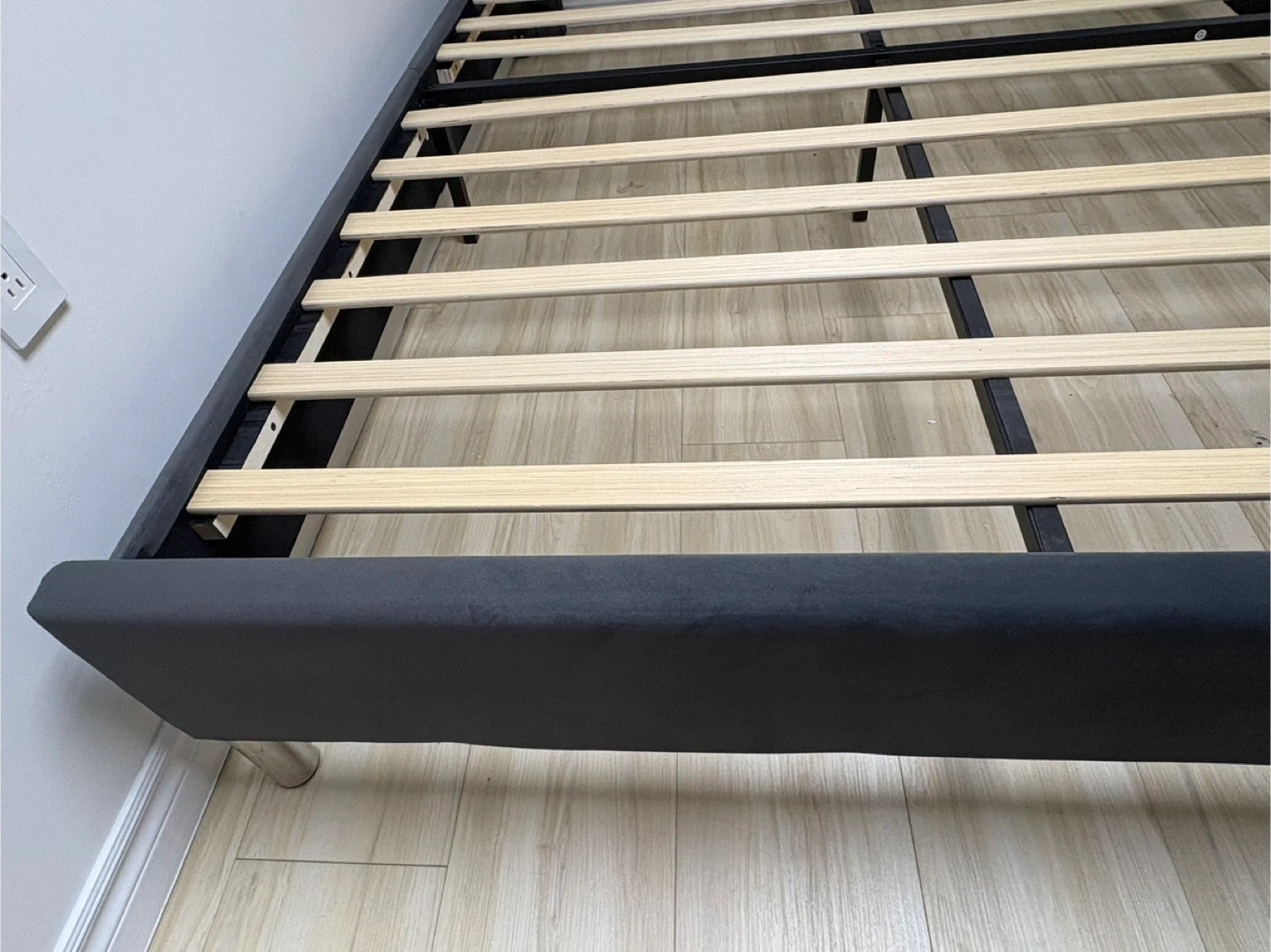 This wingback bed frame is upholstered in dark grey velvet and features decorative studs along the edges. It includes a wooden slat support system for your mattress. It's a stylish addition to any bedroom! NEW