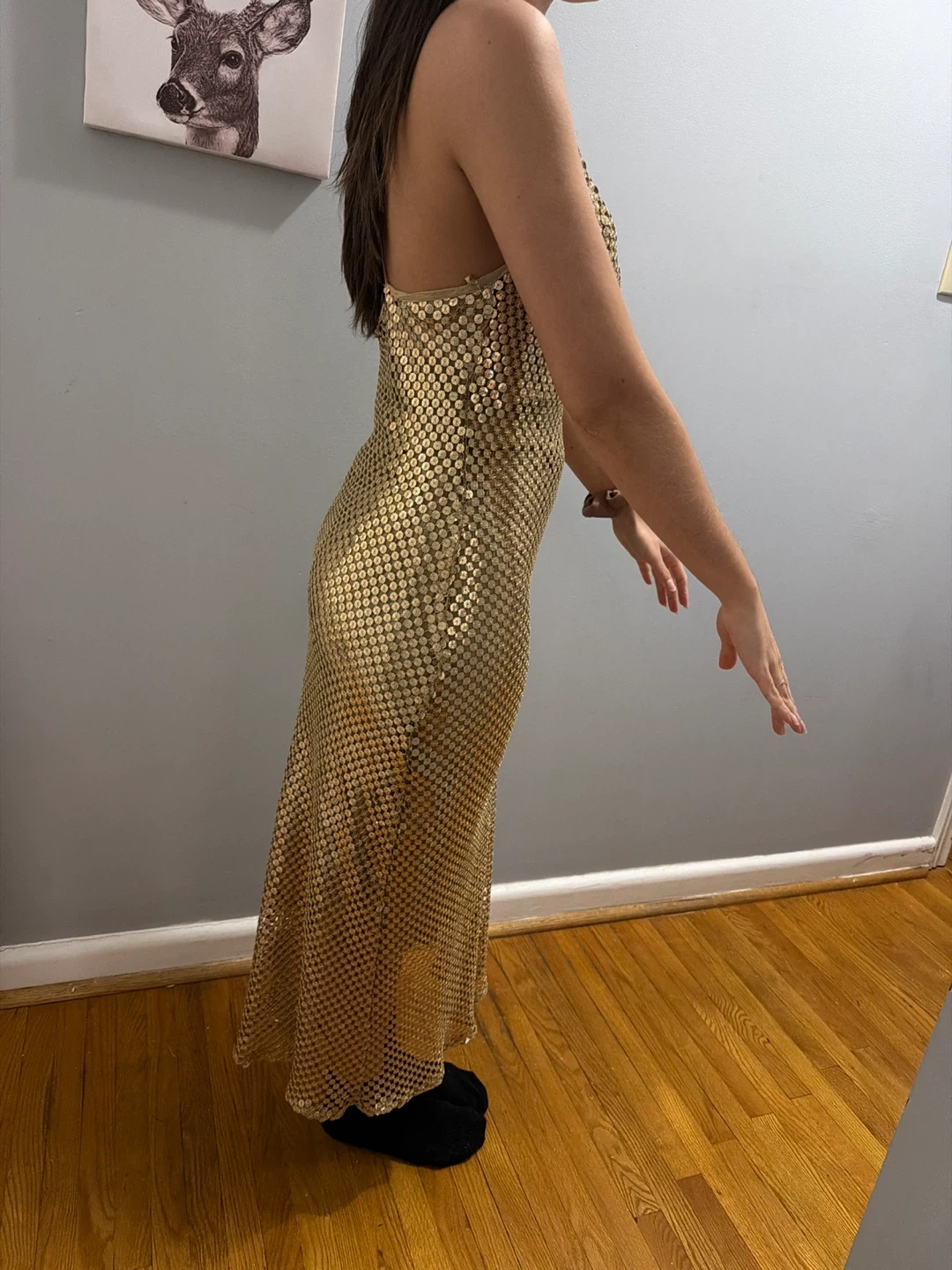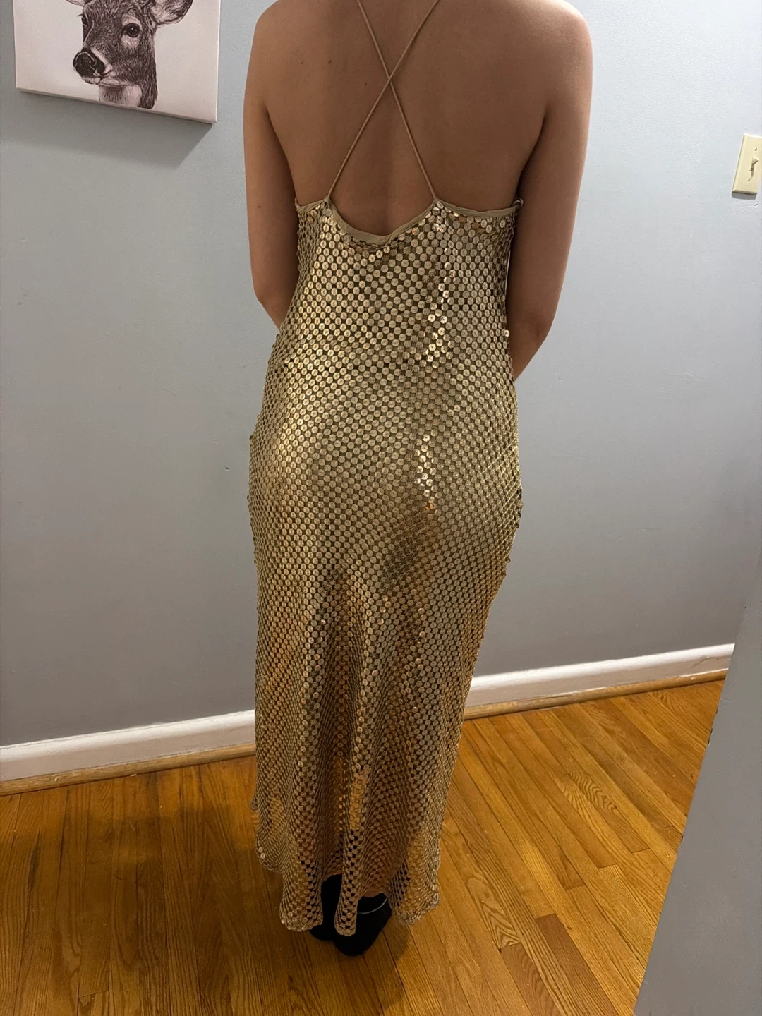 Sparkly gold sequin chainmail maxi dress with a cowl neck and criss-cross back straps. It's a real showstopper for any event! This dress is sure to turn heads.