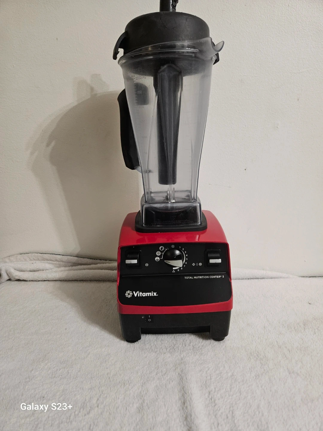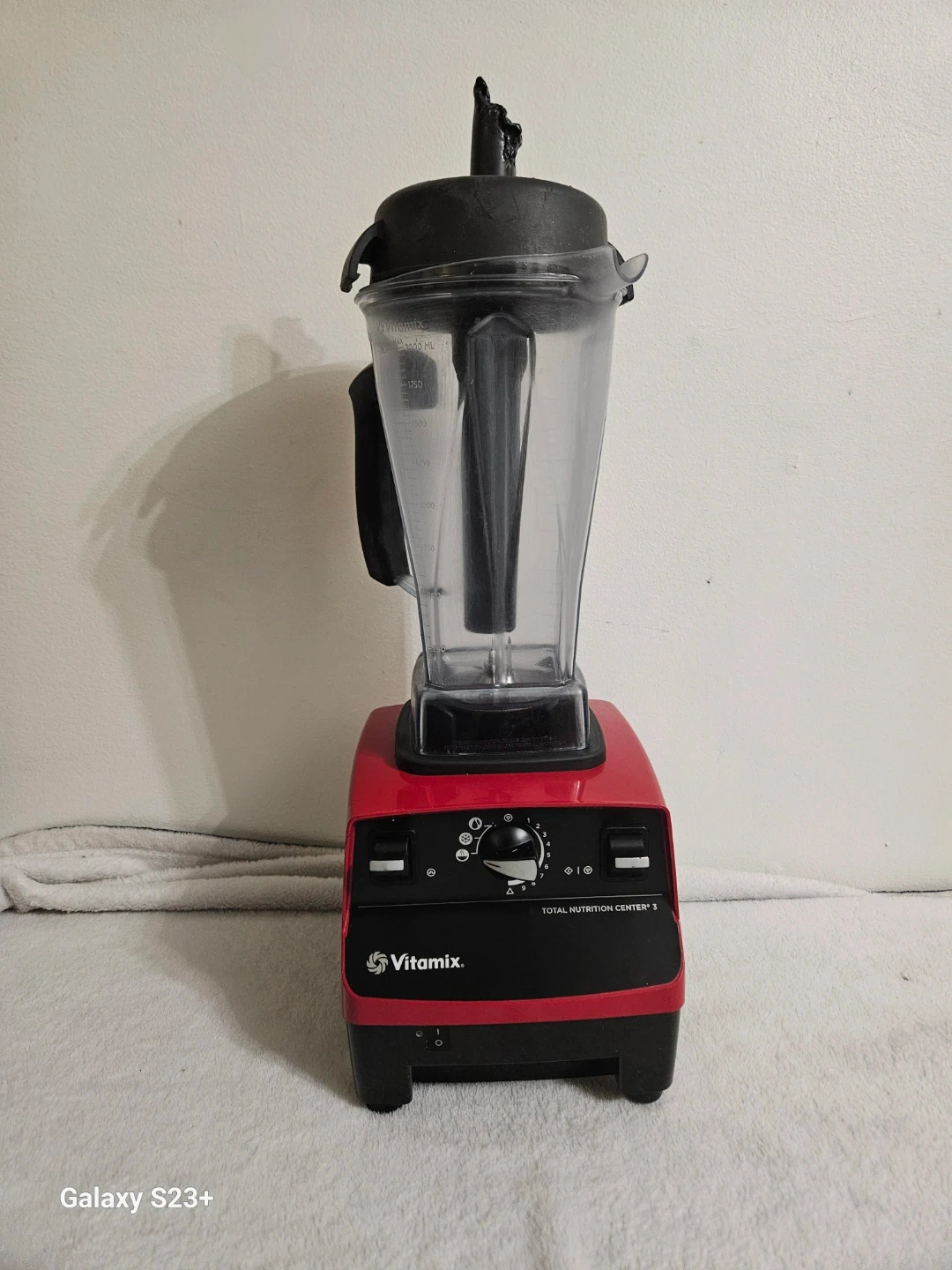 This is a red Vitamix Total Nutrition Center 3 blender. It features variable speed control. The plunger has some damage but is functional.