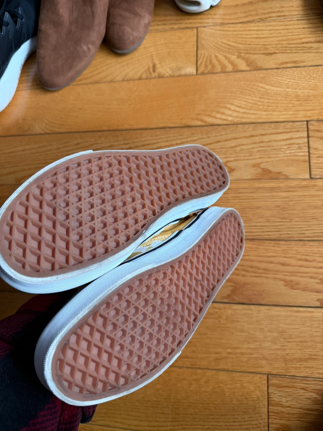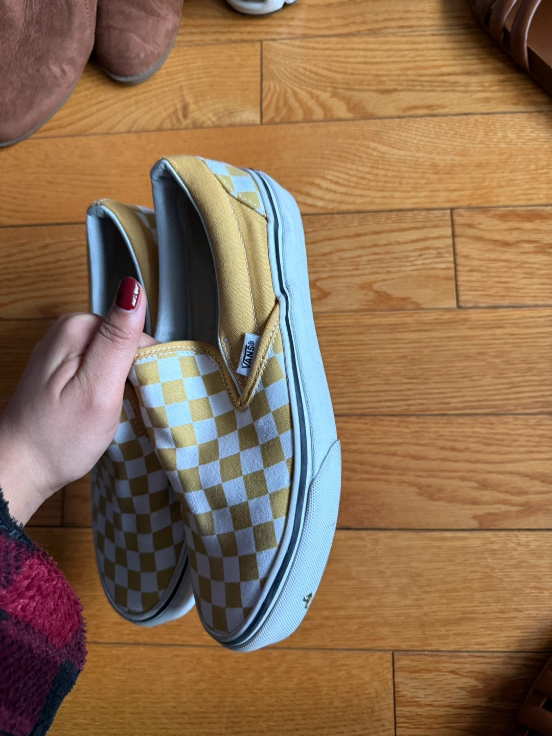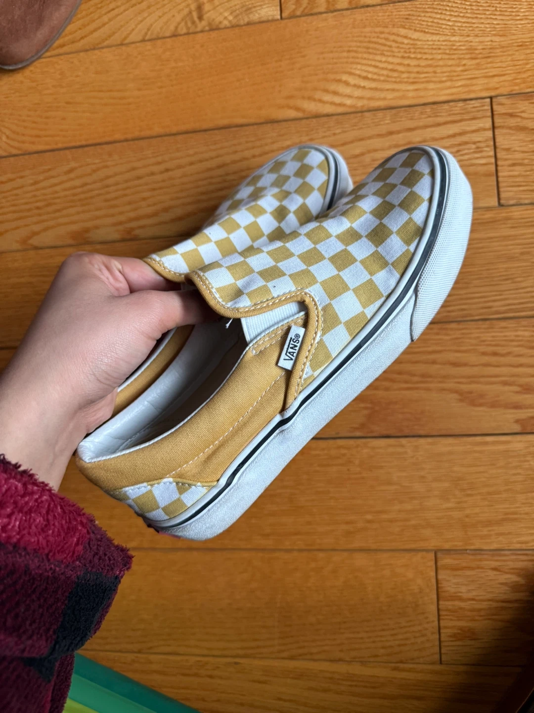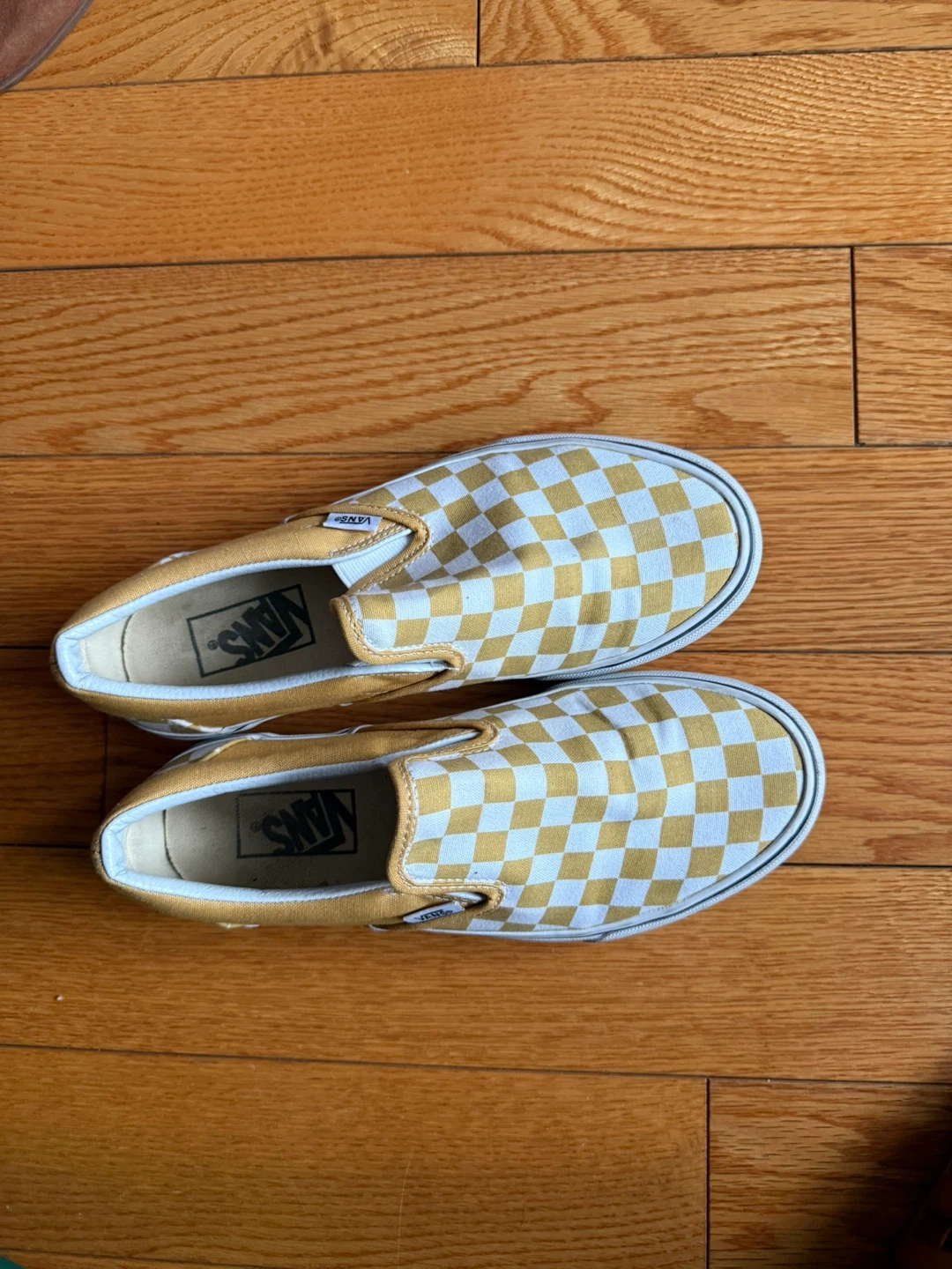 Classic Vans slip-on shoes with a yellow and white checkerboard pattern. These are comfy for everyday wear. Great for casual outings!