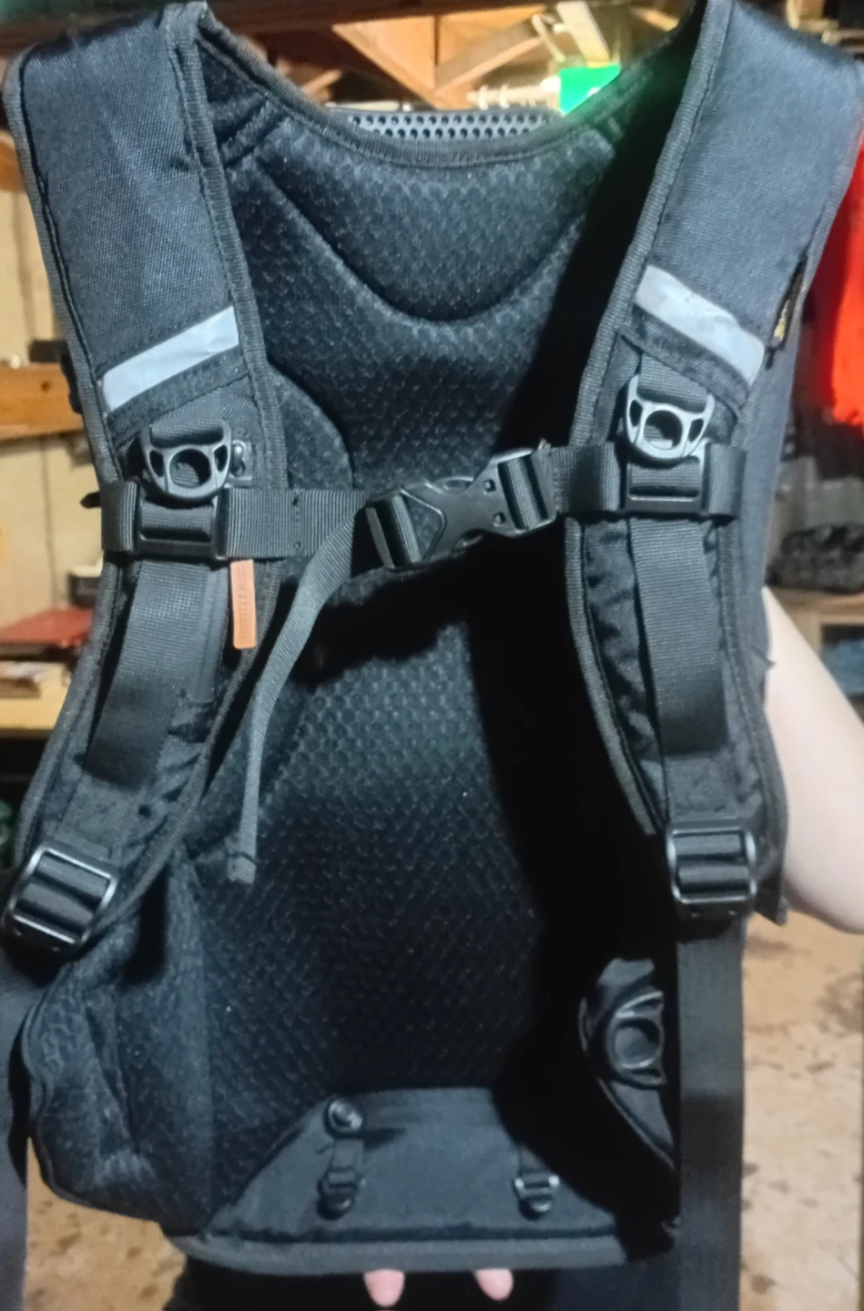 This black backpack features a carbon fibre style hard shell front. It has padded shoulder straps for comfort. It's a durable option for carrying your gear.
