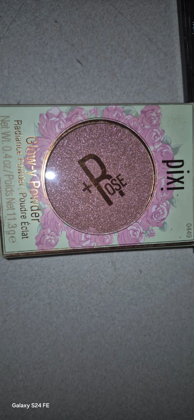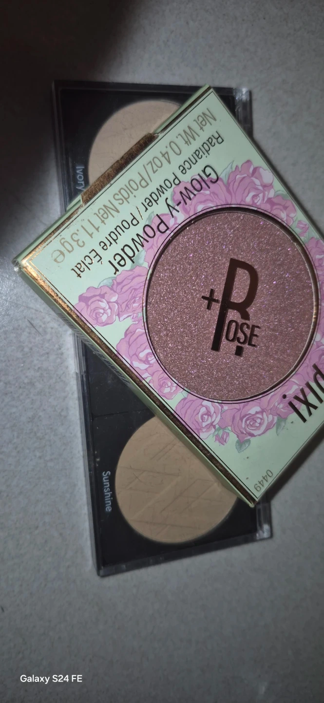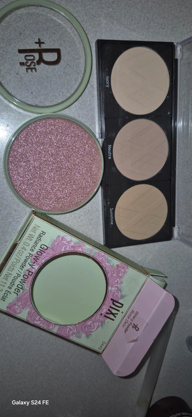 This is a Pixi Glow-y Powder in Rose Glow and a Pixi MatteLast Liquid-Lip in a trio palette with shades Ivory, Neutre, and Sunshine. The Glow-y Powder is a radiance powder with a shimmering finish.