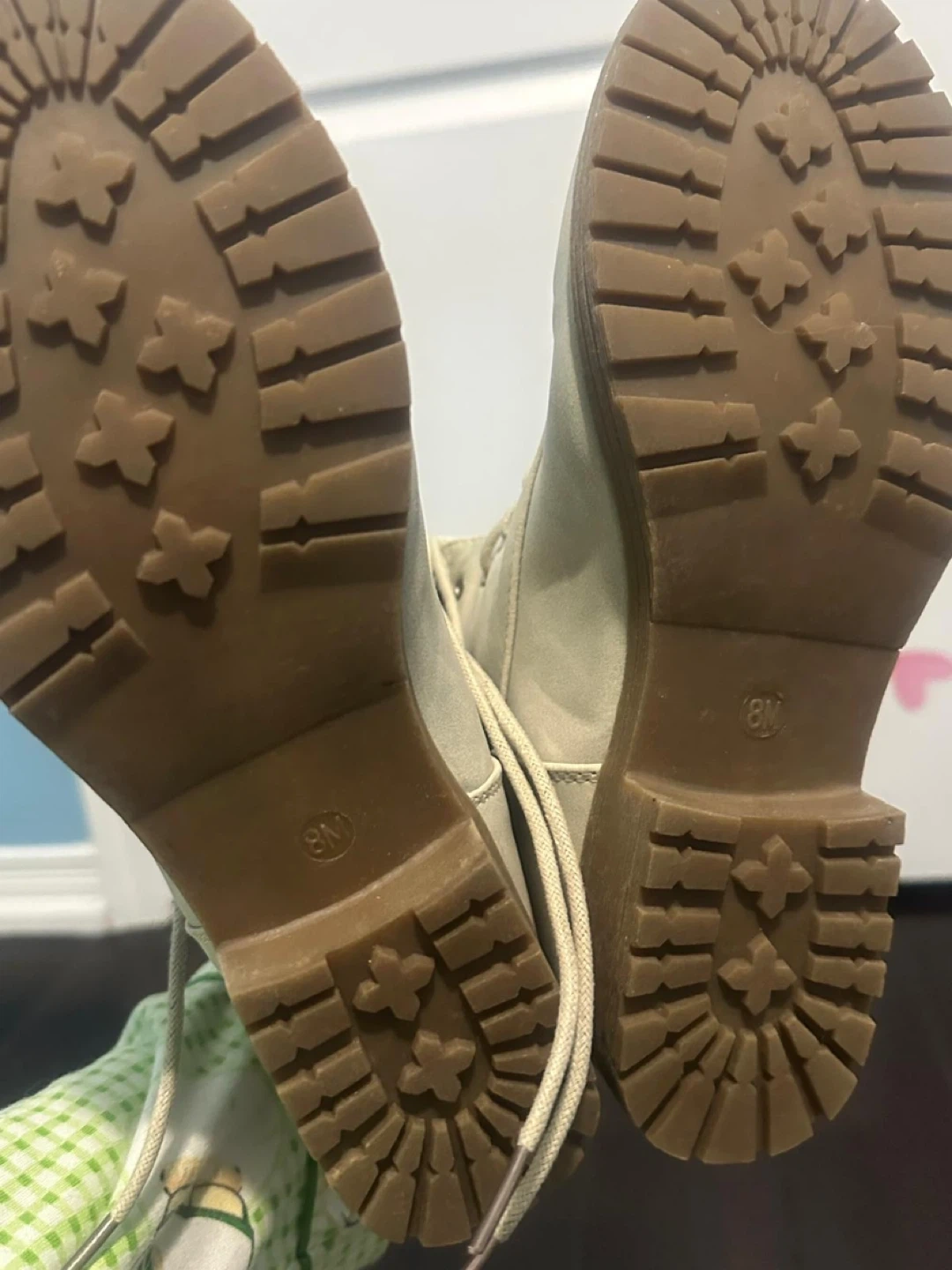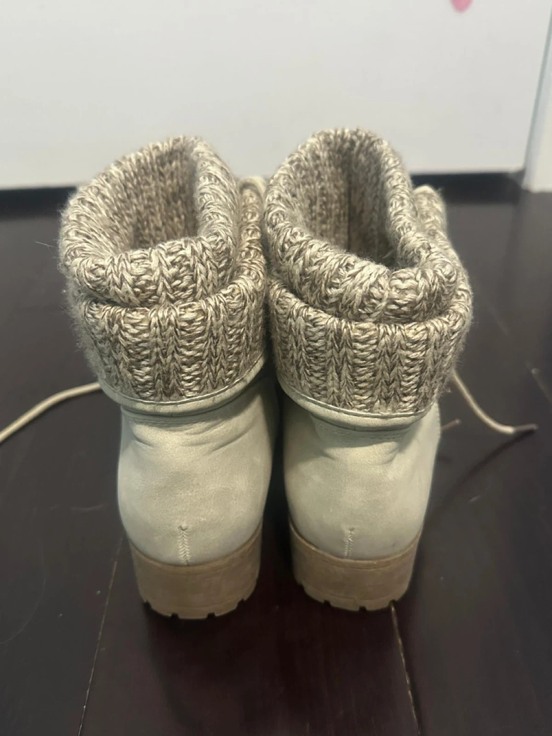 Selling a pair of women's ankle boots. They're a size 8 and have a cute lace-up design with a knitted wool cuff. These boots are in good condition and ready for a new owner!