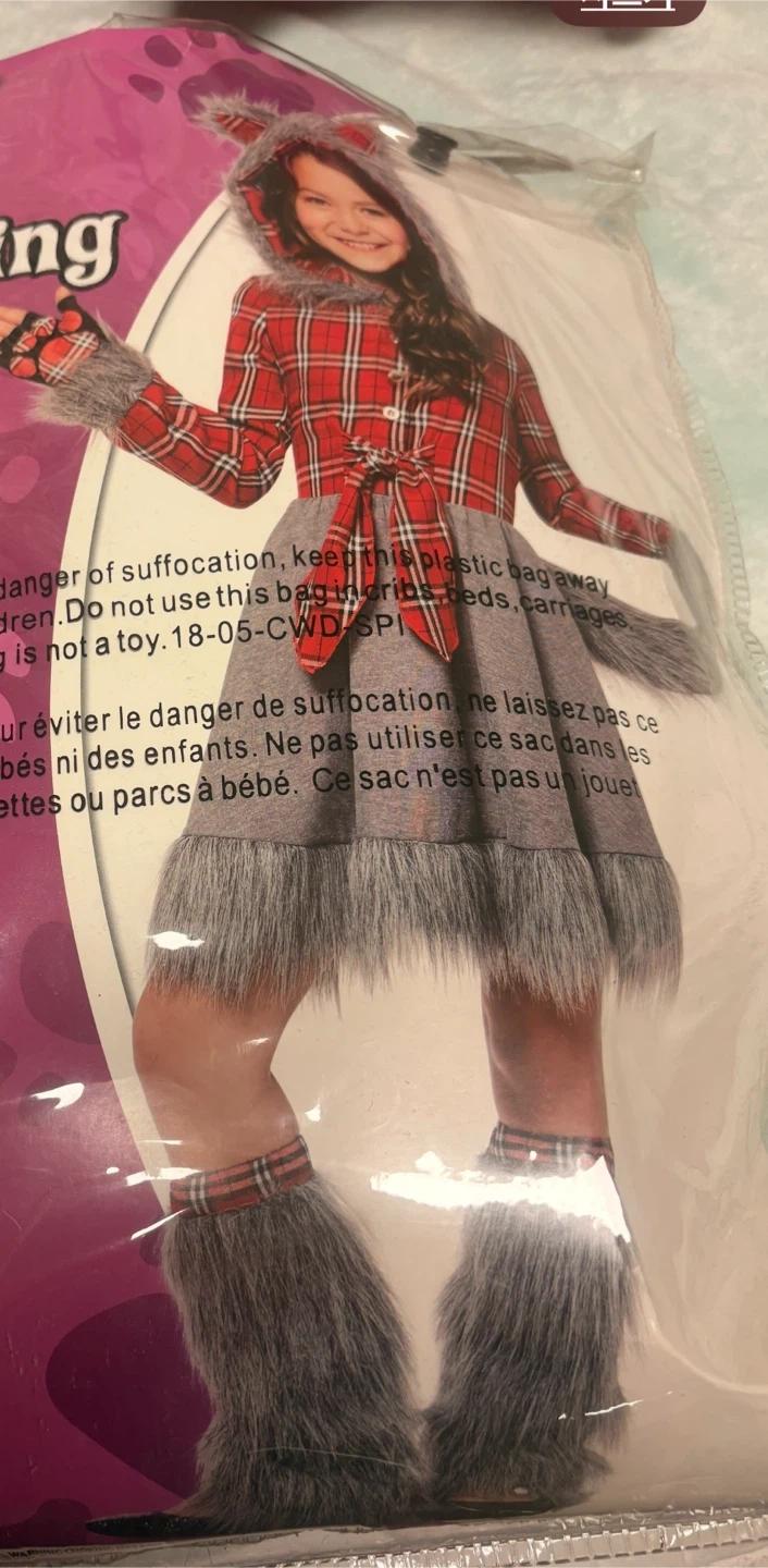 Selling a child's wolf costume, size large (12-14). It's a fun and playful outfit perfect for dress-up or Halloween! The costume includes a hooded top, skirt, and furry leg warmers.
