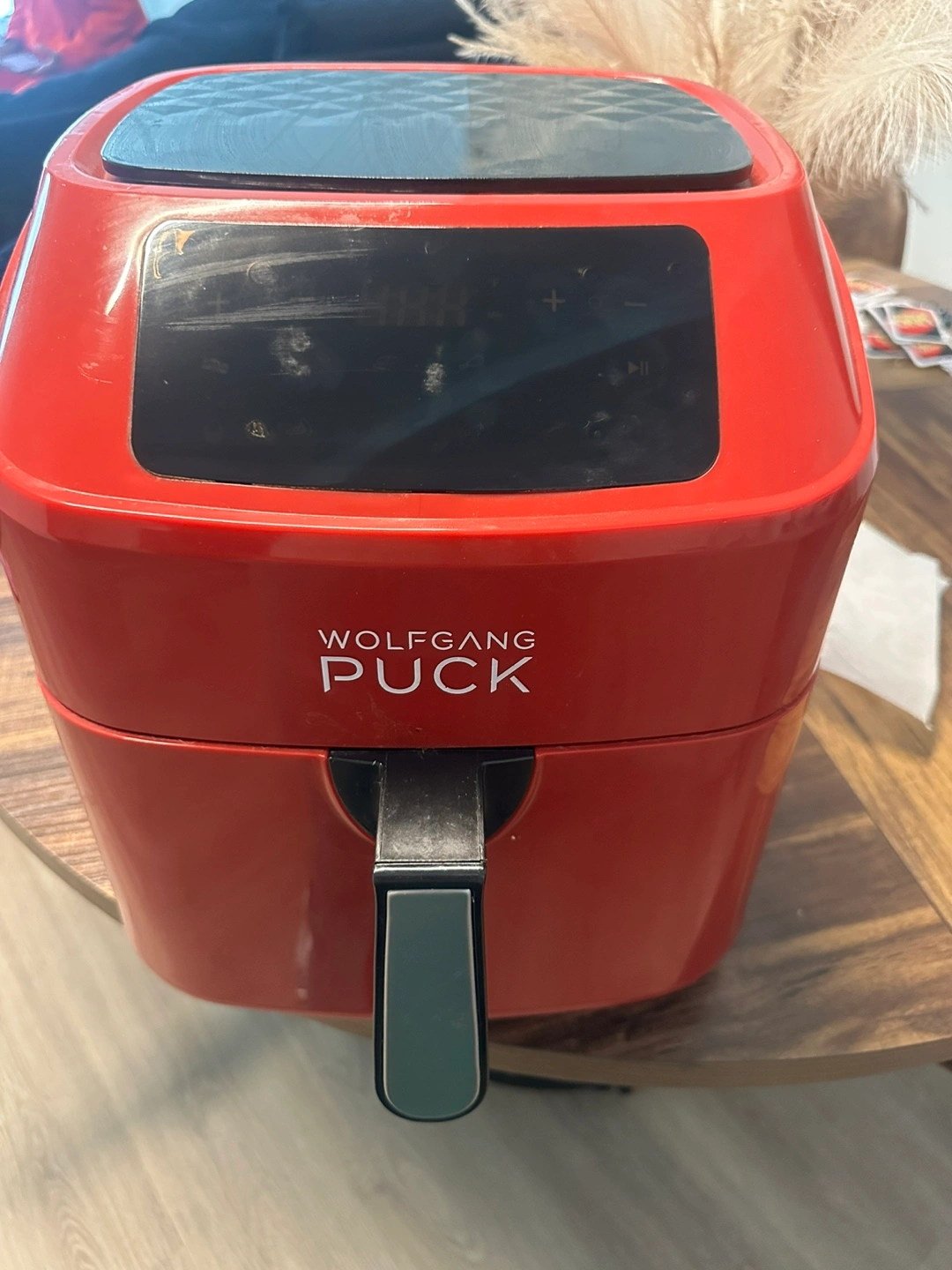 68Bright red air fryer. Includes a black handle with a small screen. Controls are visible on the screen. Cooking with this will bring peace to your kitchen.