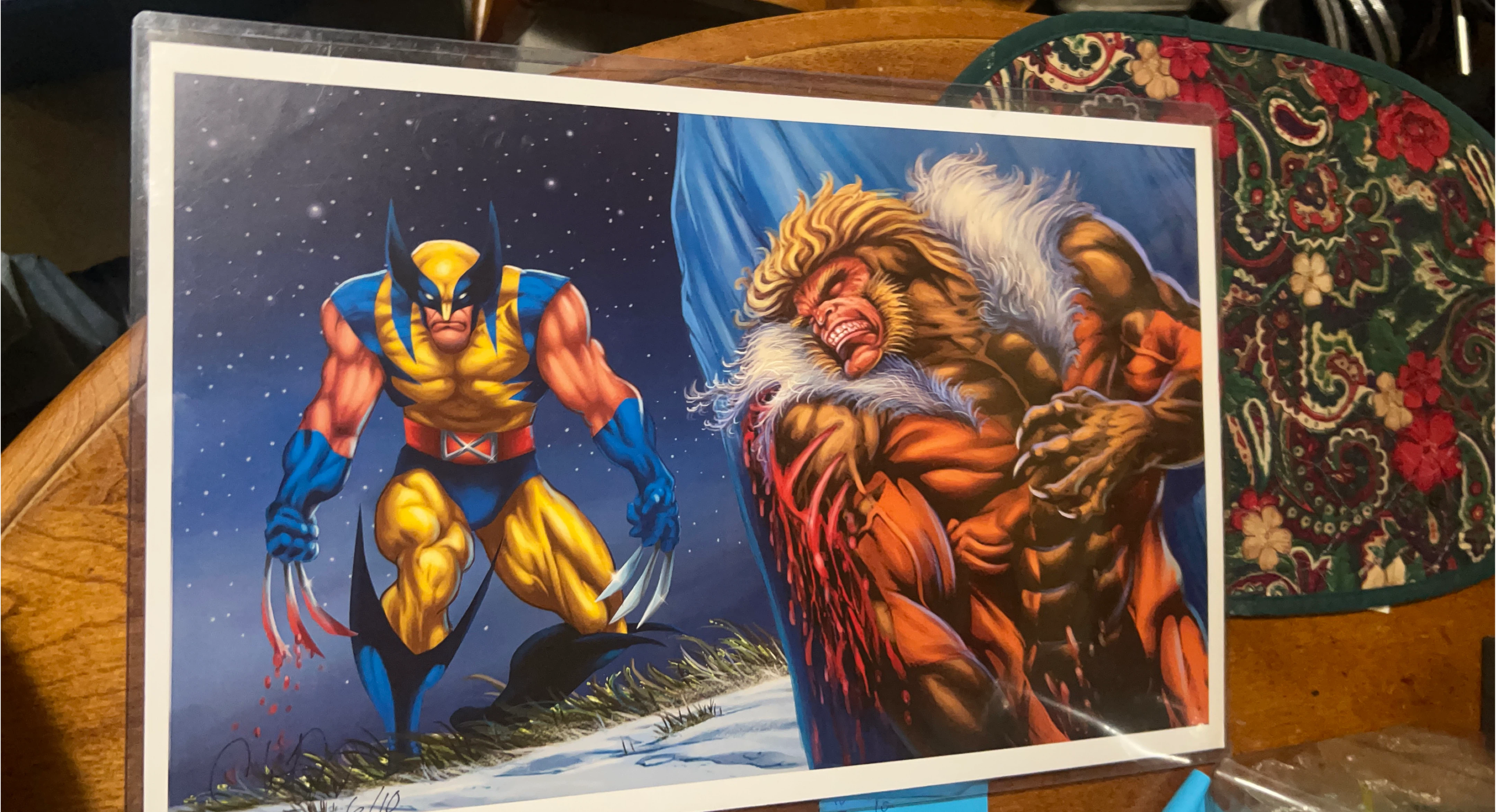 10Here's a cool art print featuring Wolverine and Sabretooth! The print looks to be in great shape and would be perfect for any Marvel fan's collection. Print is signed by artist.
