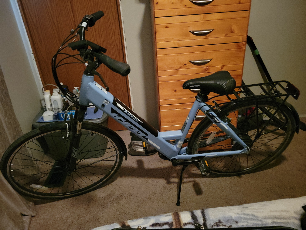 10WOMAN HYPER ELECTRIC BIKE PEDAL ASSIST 7 SPEED, 36 VOLTS BATTERY FULLY CHARGED, GOOD TO GO FOR 20 KMS. CHARGES IN 4 HRS. BIKE IS BLACK AND BLUE.