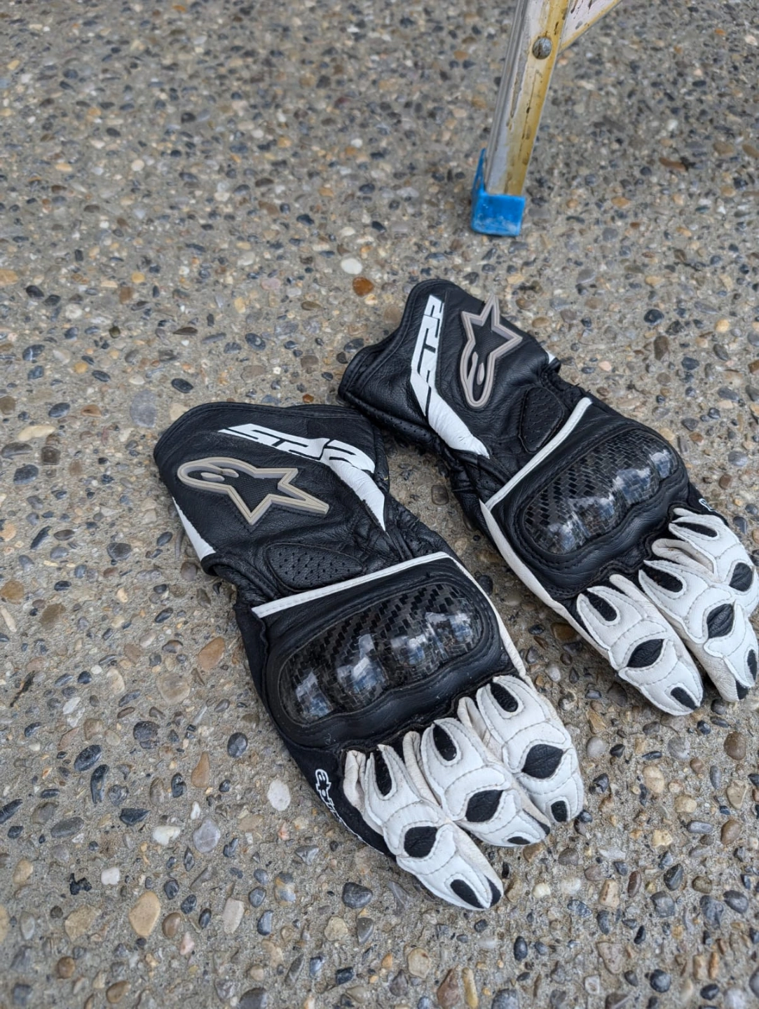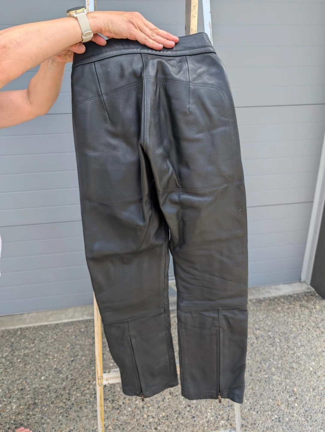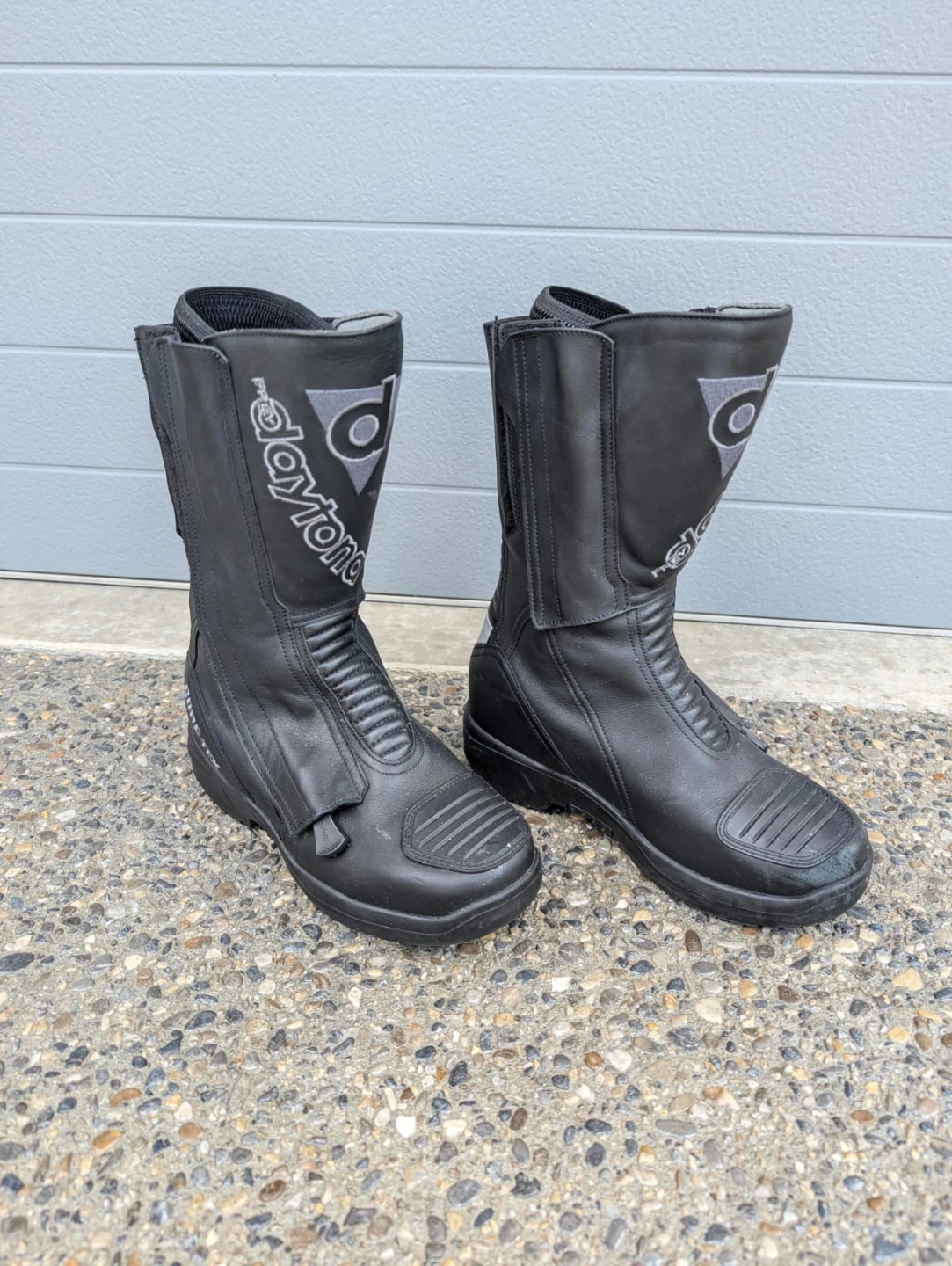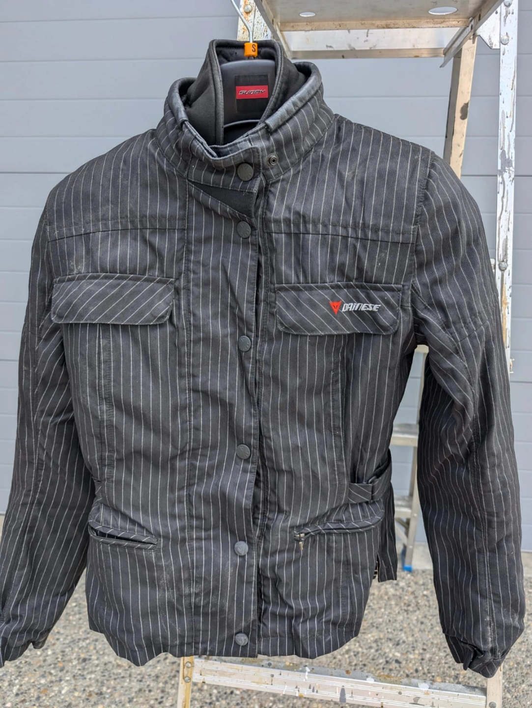 95Women's motorcycle gear. Dainese striped jacket, black leather pants, Daytona boots, and Alpinestars gloves. Good condition. all size small with boots EU 37