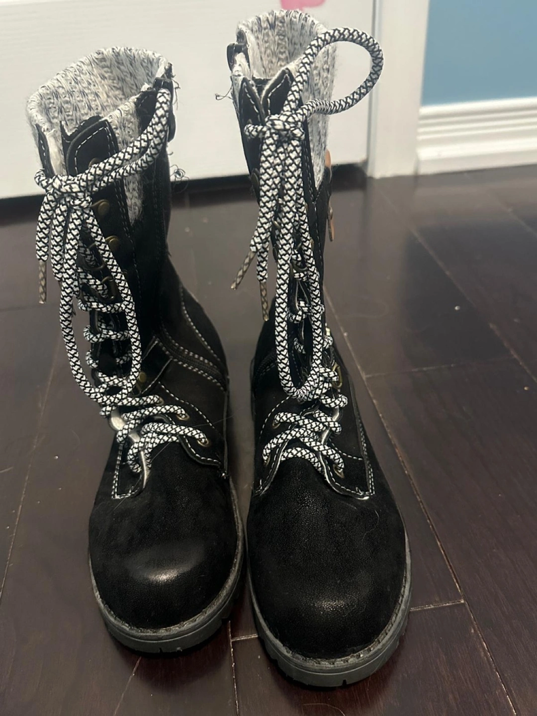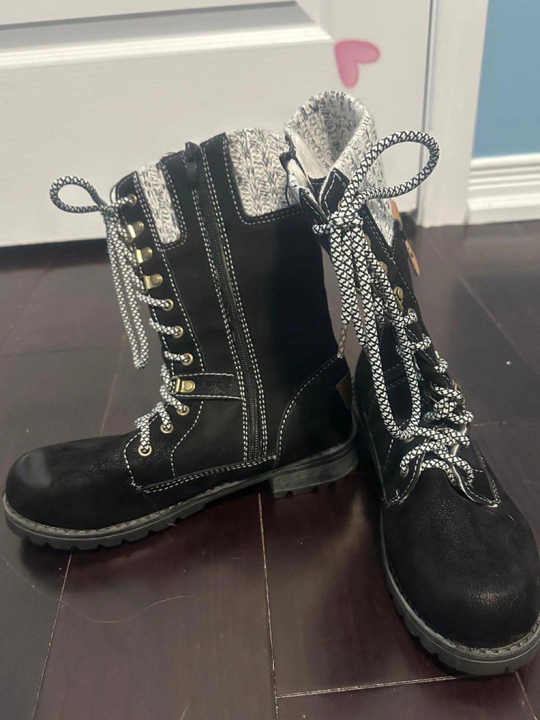 Selling a pair of boots in size 8 Women . They have a cute knit detail around the top and are in great condition. the Black one is Brand new never worn.