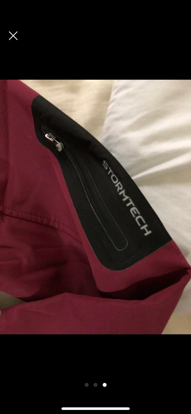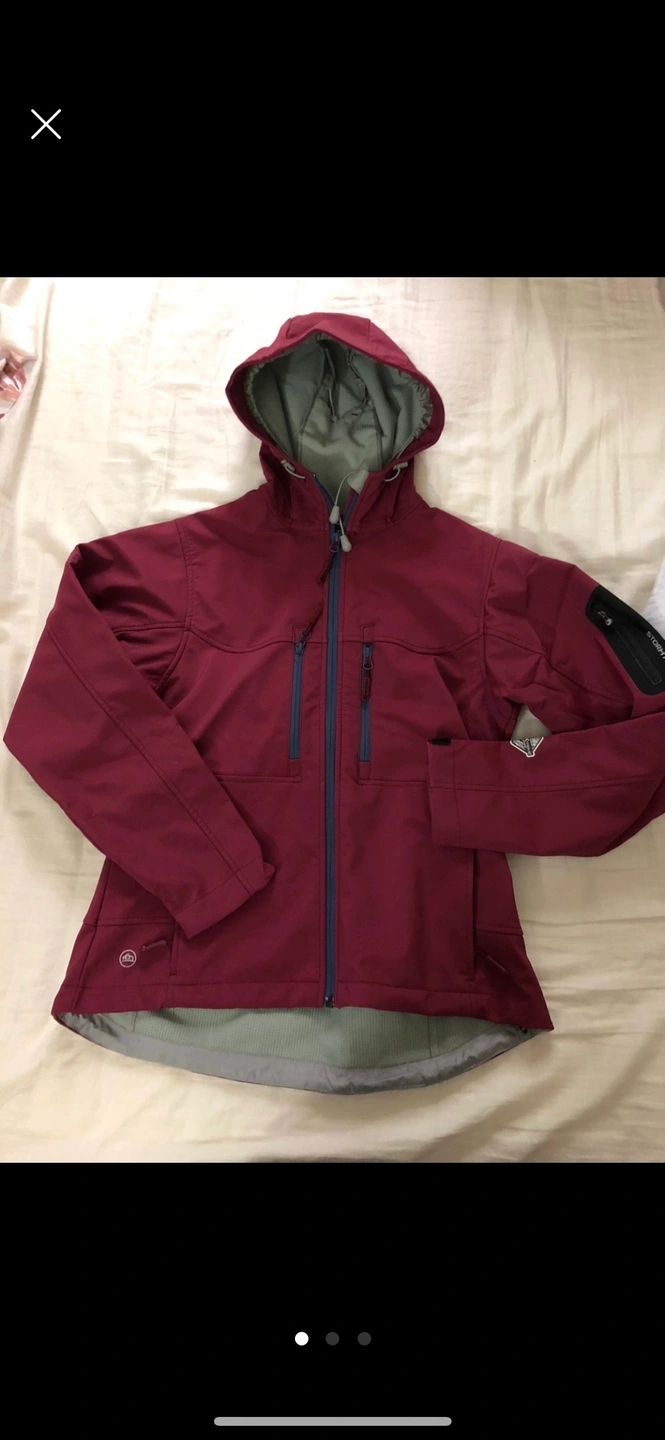 115Women's red jacket with a hood. Zipper closure. Two zipper pockets on the front. Zippered pocket on the left sleeve.like new waterproof $30 firm thanks.