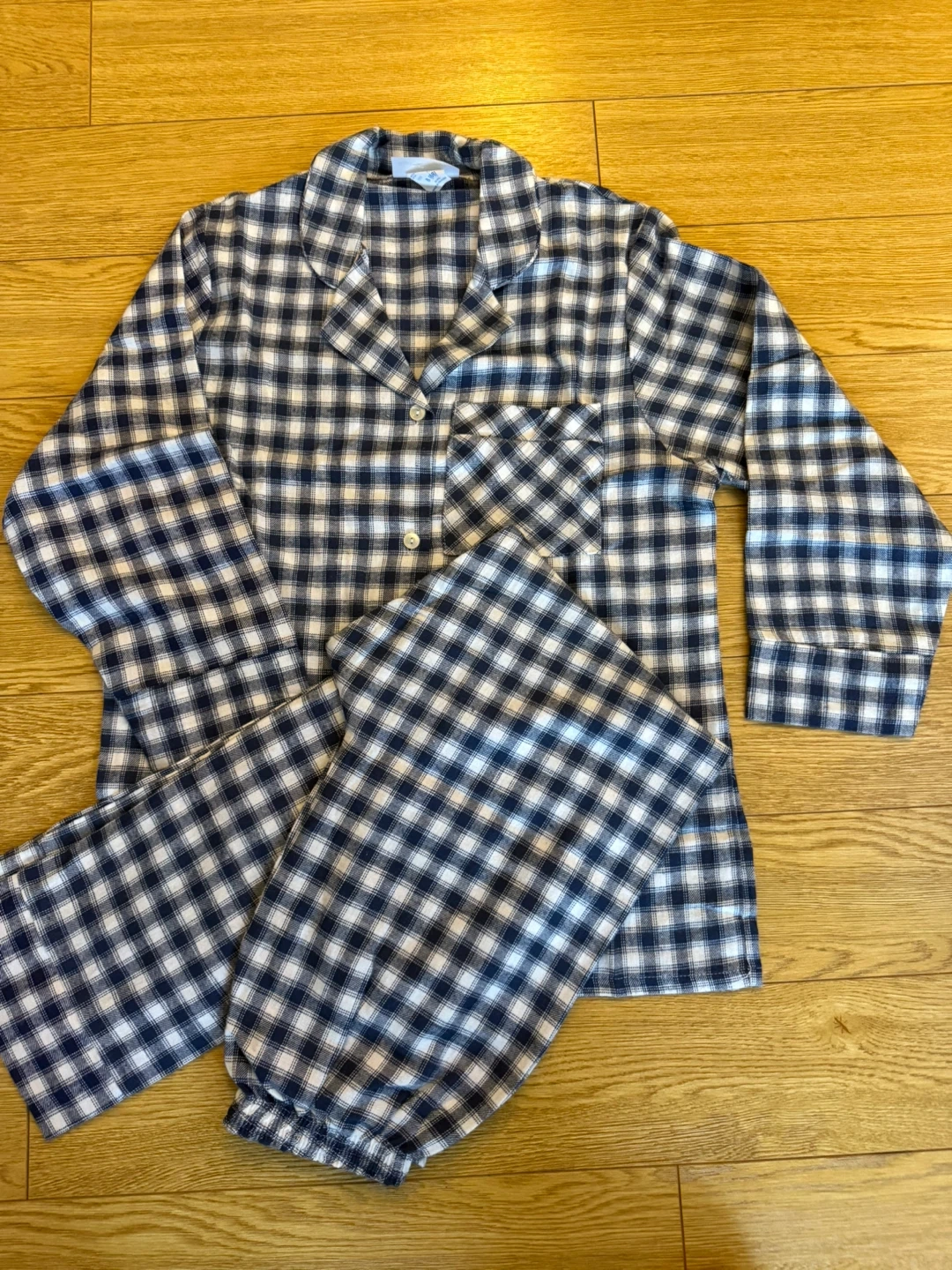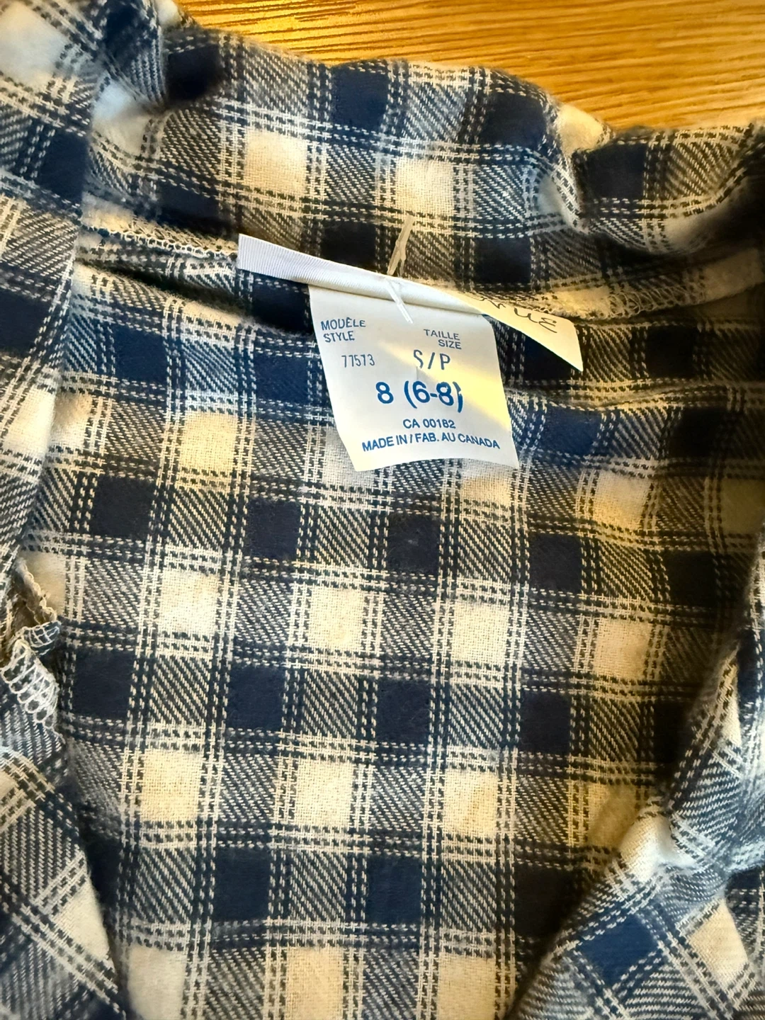 441This cute Pyjama set features a classic plaid pattern in blue and white. The set includes a long-sleeved top and matching pants. It's a size 8 (S/P). Brand new never worn. Has been sitting in the closet. Extremely soft material