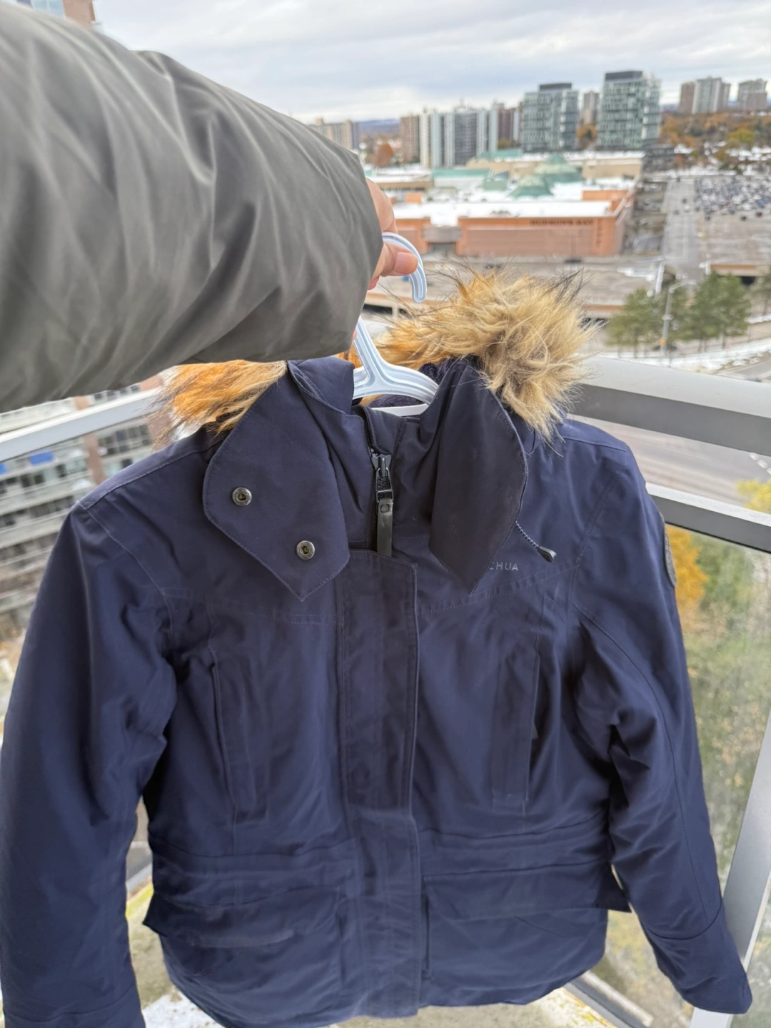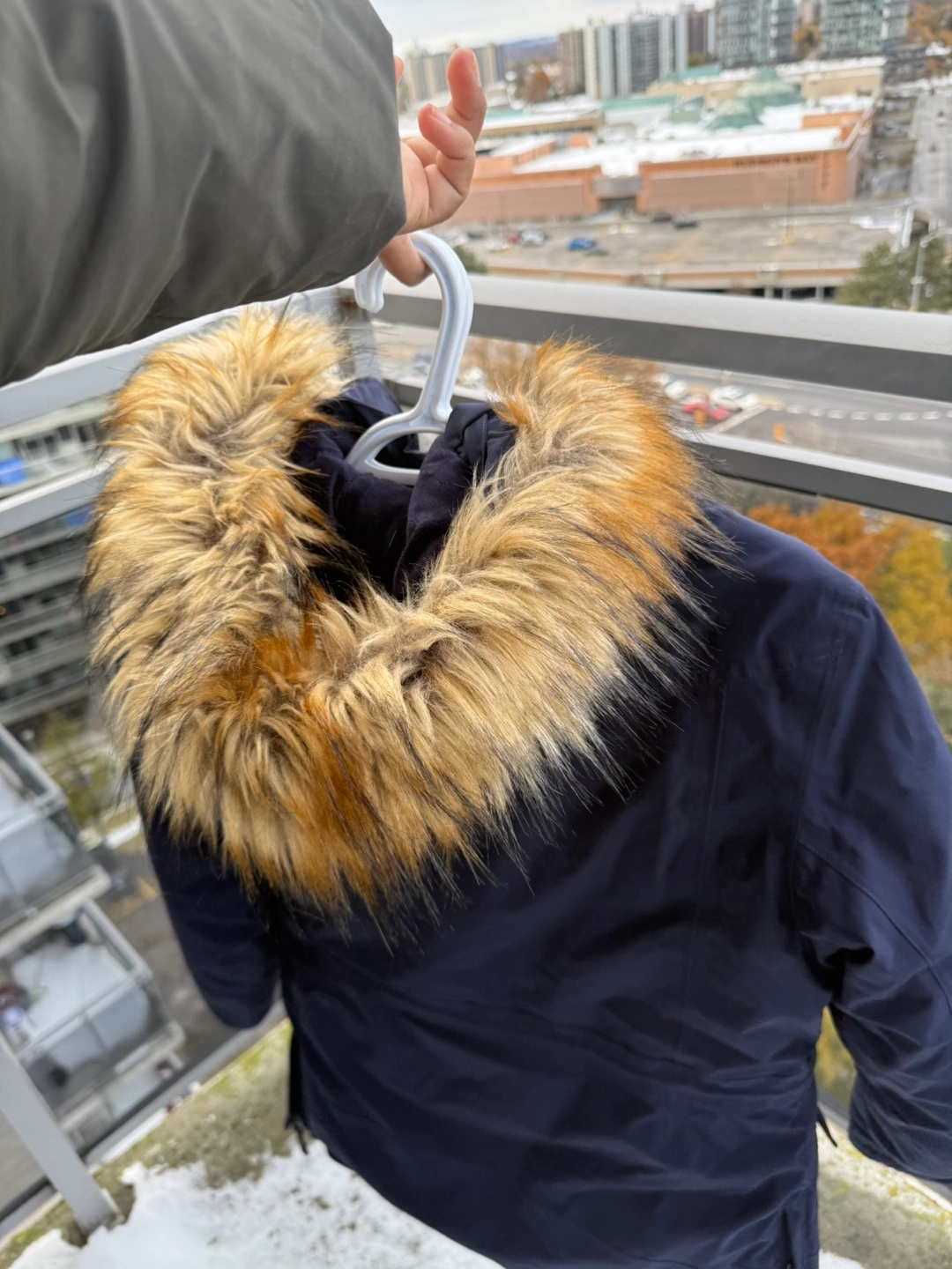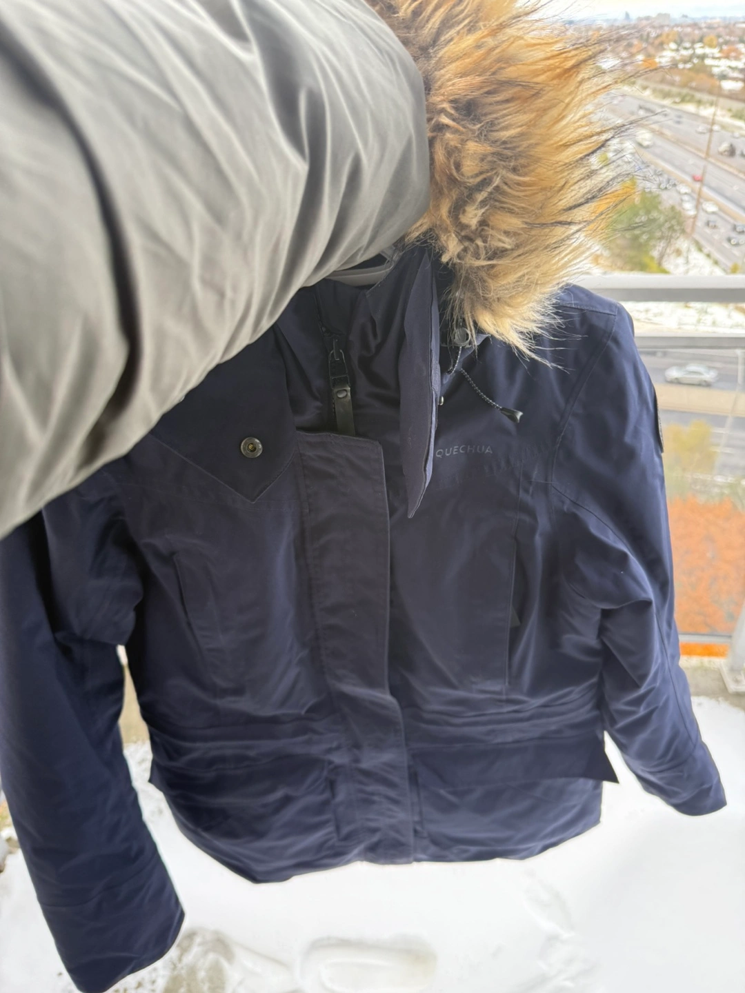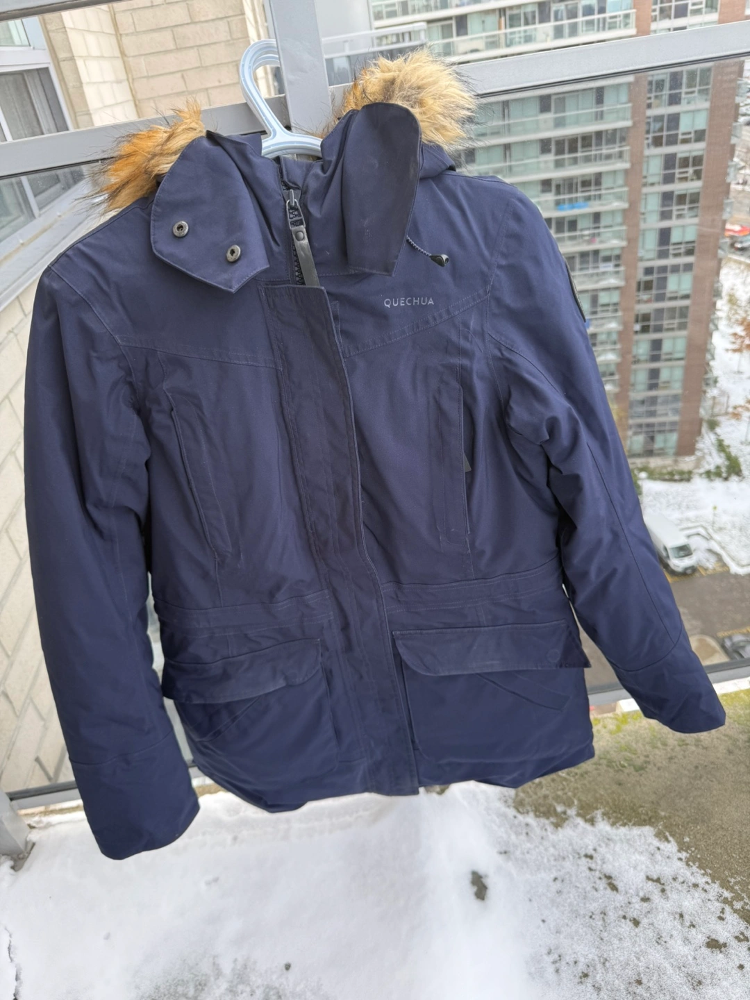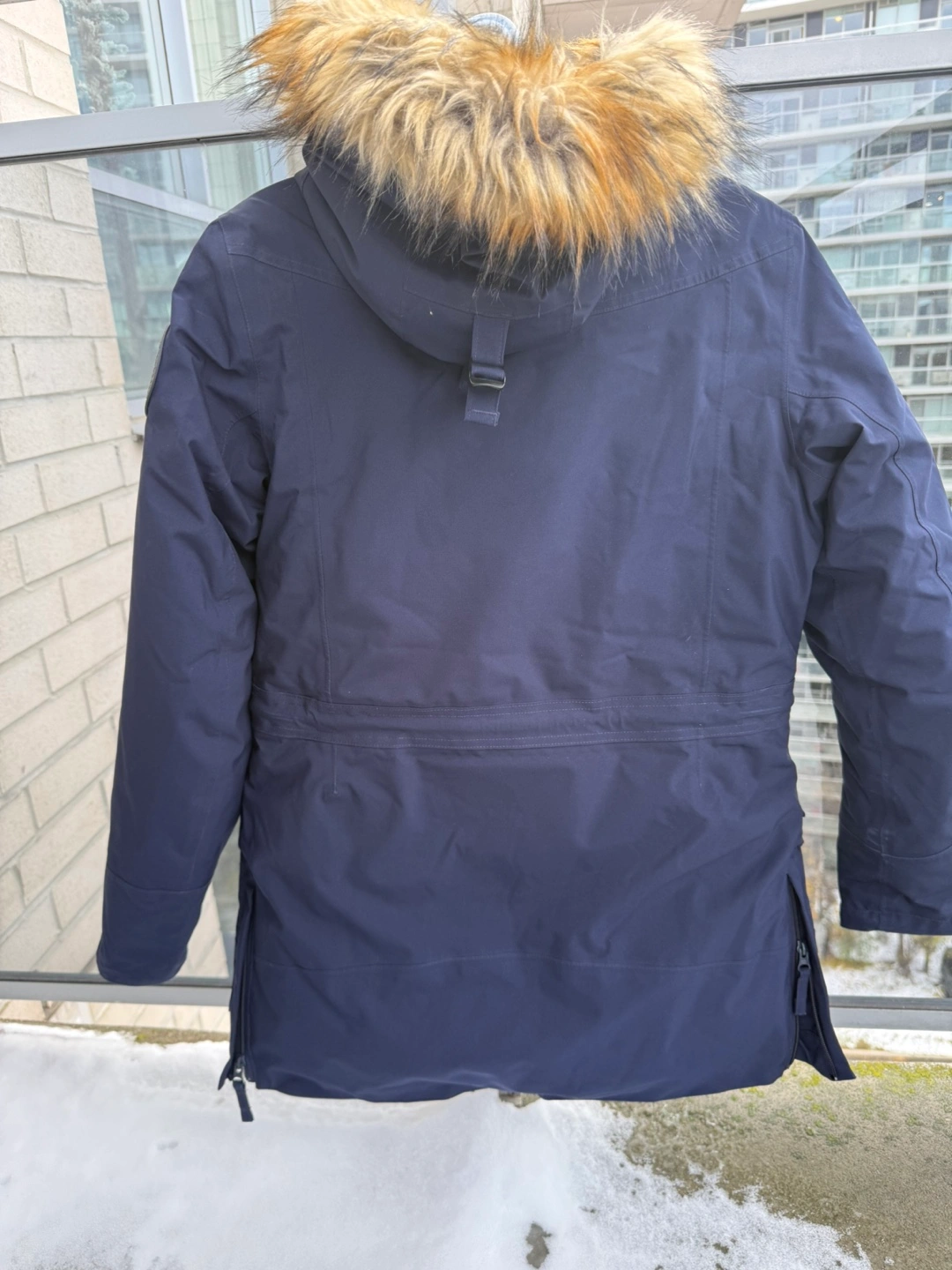 60Navy blue insulated jacket that covers upto mid thighs. Great pockets and protects from snow with the fur.