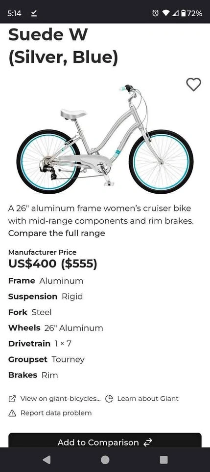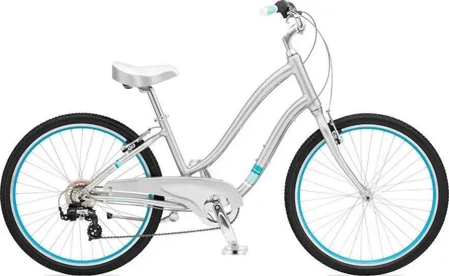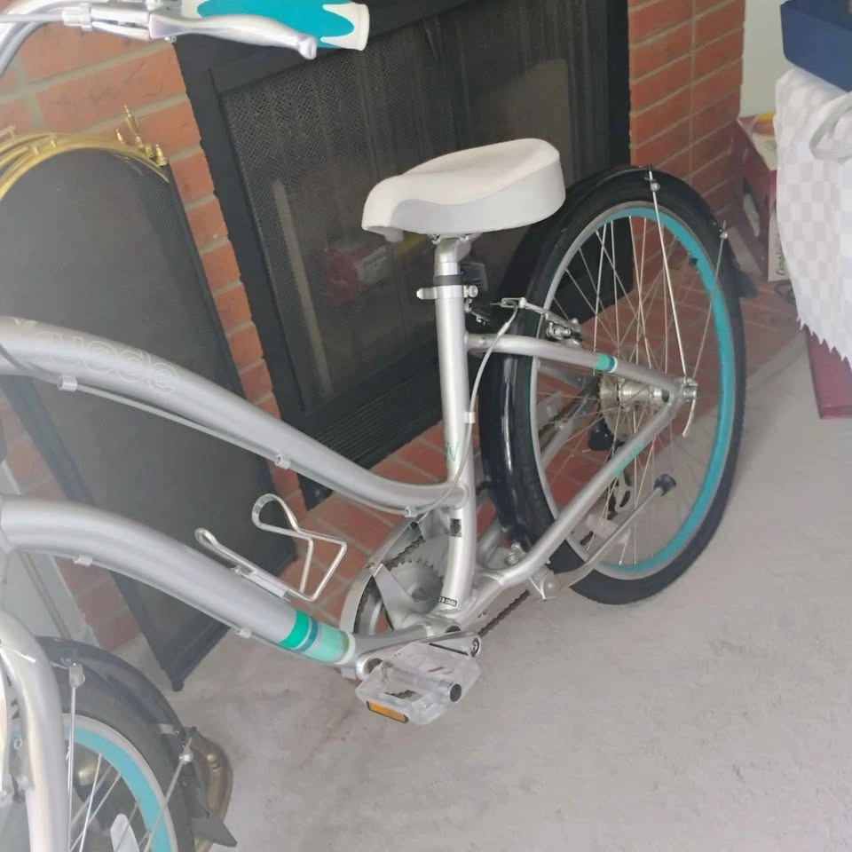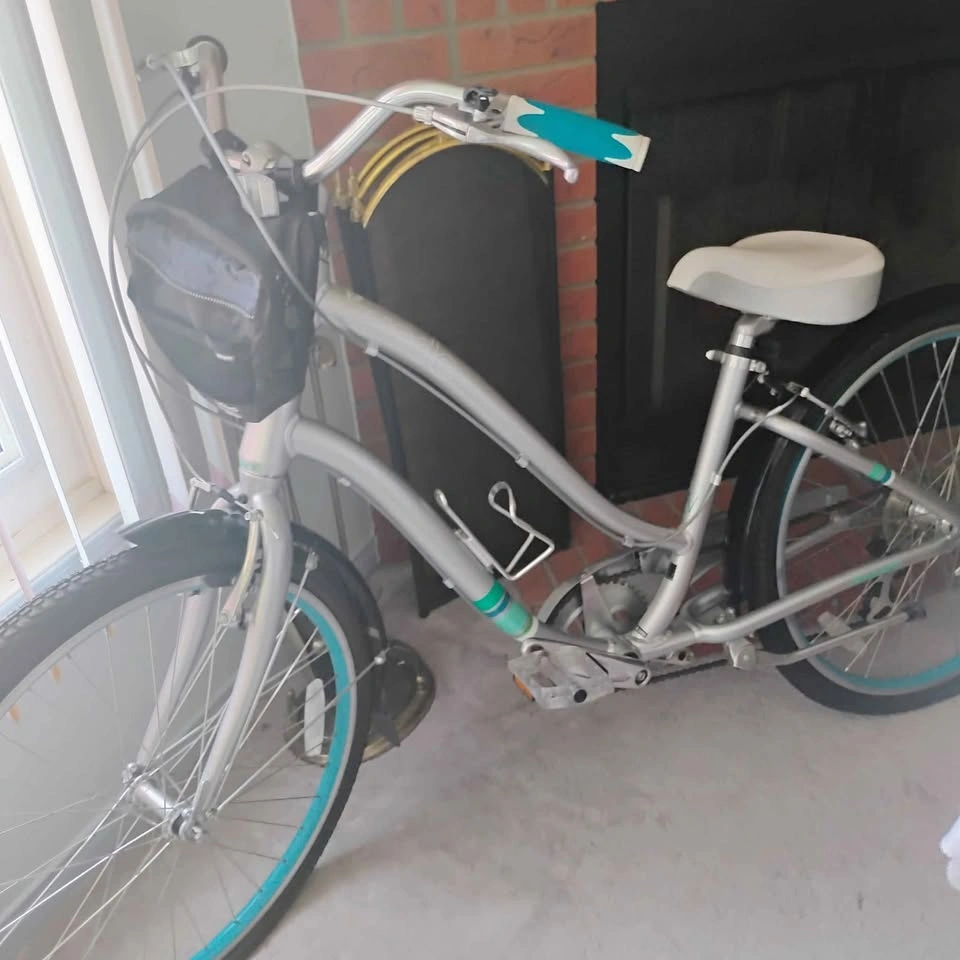 I'm selling my GIANT Suede cruiser bike, featuring a silver and turquoise colour scheme. This women's bike has a 26" frame and comes with some useful extras, including black mud covers, a water bottle holder, silver helmet and a front pouch for storage. Wide comfortable seat