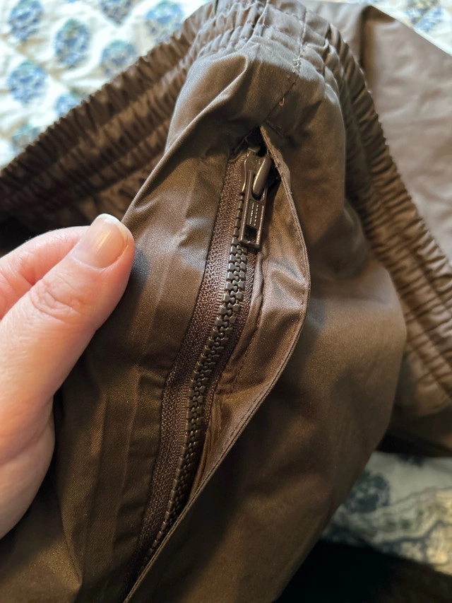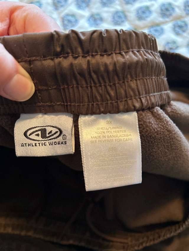 34First photo is the front of the pants, second photo is the back. From pet-free and smoke-free home. Barely used. Drawstring waist and elastic cuffs at ankles, zippered pockets. Fleece lining.