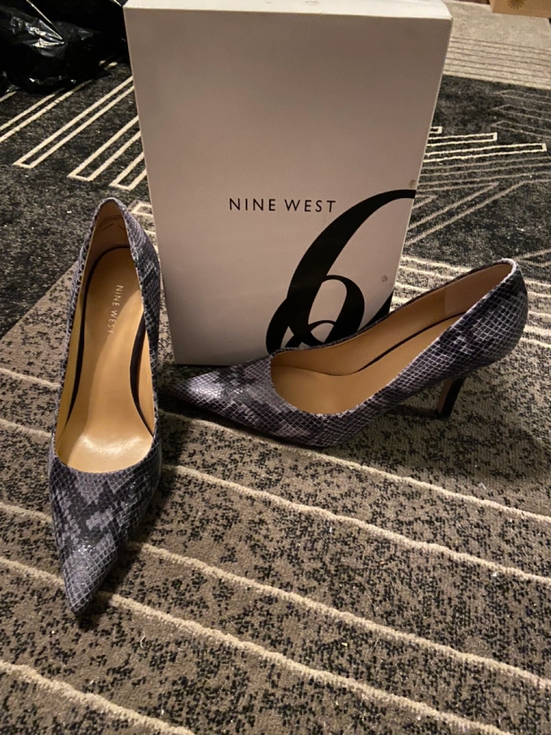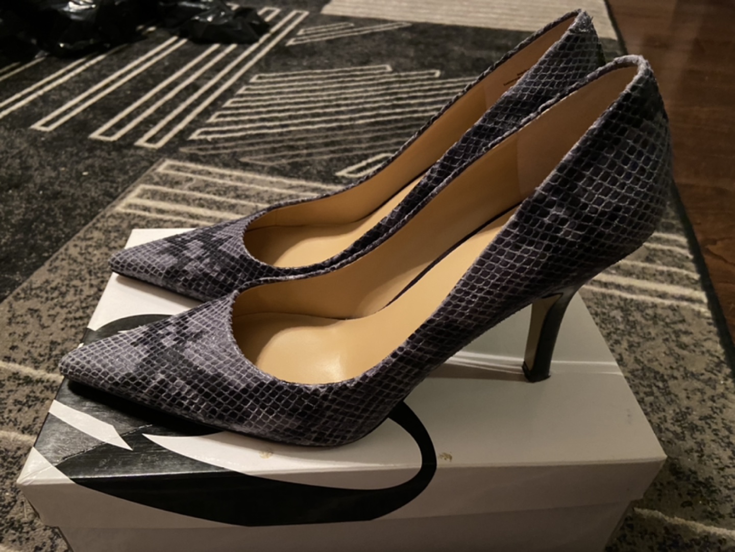 Size 8.5 Nine West heel used once and in new condition grey black snake like look