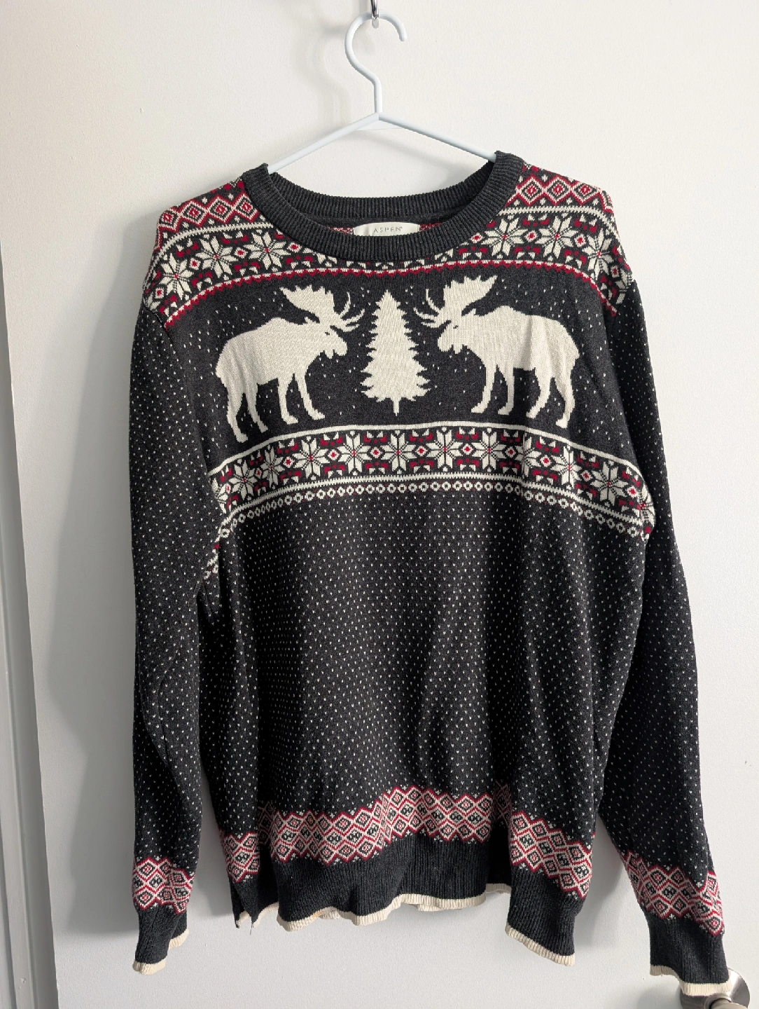 Christmas sweater features a fun moose and Christmas tree design. It's an XL size and made from 100% cotton