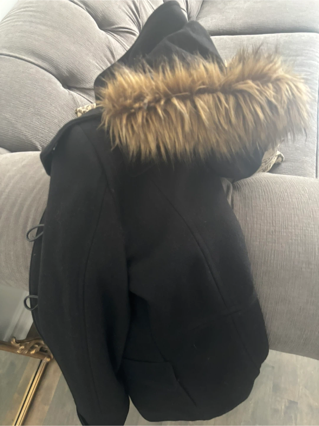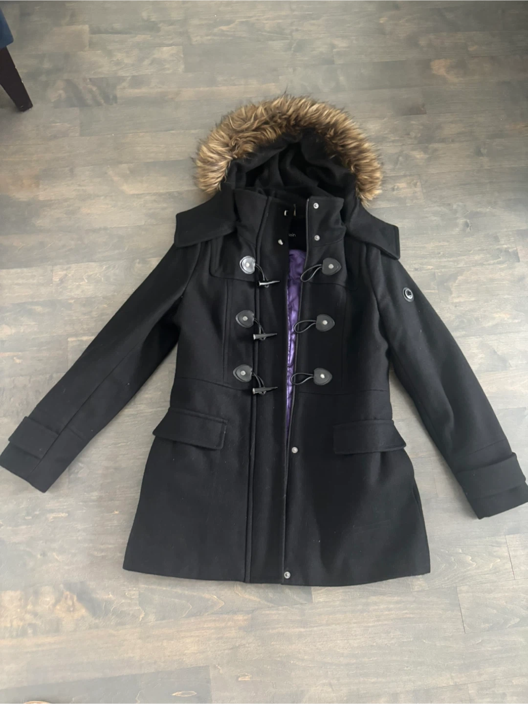 18Women’s Calvin Klein wool coat with fur hood In good condition size 8 Women’s wool pea coat with Ipper and button closure Purple satin lining. Really warm Removable fur hood.